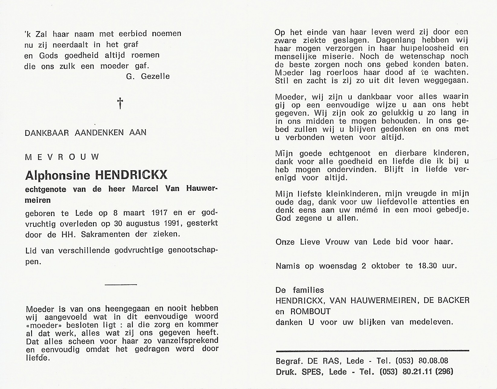 Maria Alphonsina Hendrickx Geboren: 8 maart 1917 — Lede Overleden: 30 augustus 1991 — Lede |