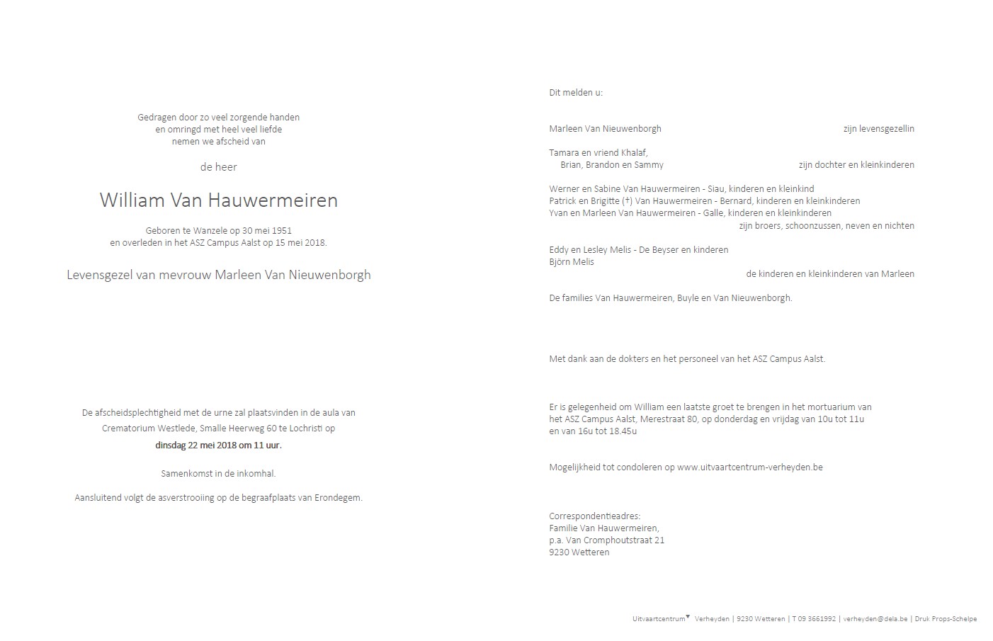 Overlijden van een kleinzoon | William Van Hauwermeiren 15 mei 2018 (Leeftijd 116 jaar) |