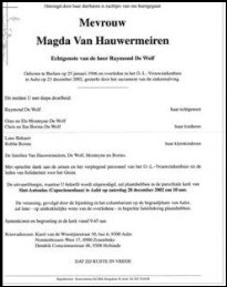 Overlijden van een echtgenote | Magda Van Hauwermeiren 23 december 2002 (Leeftijd 59 jaar) |