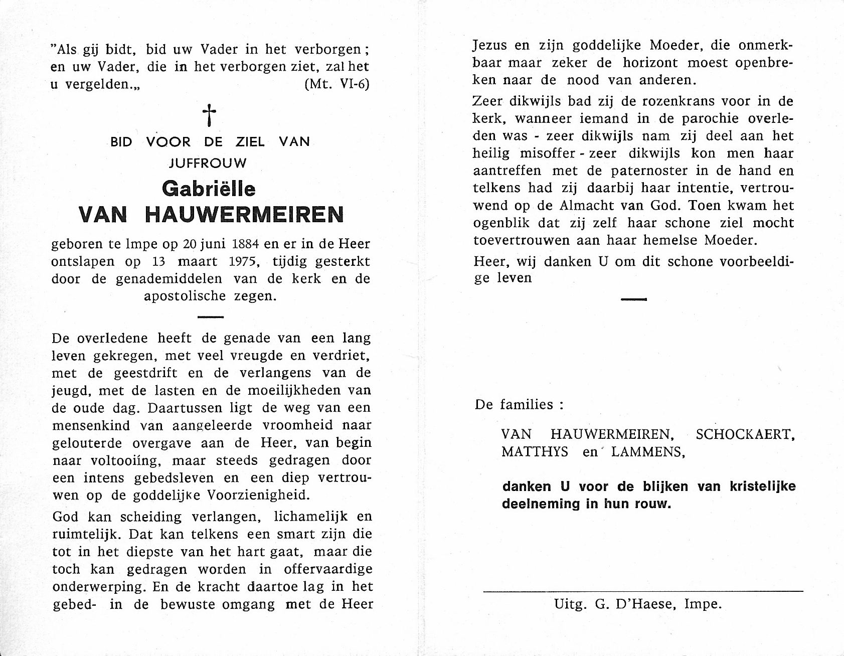 Marie Gabrielle Van Hauwermeiren Geboren: 20 juni 1884 29 29 — Impe Overleden: 13 maart 1975 — Impe |