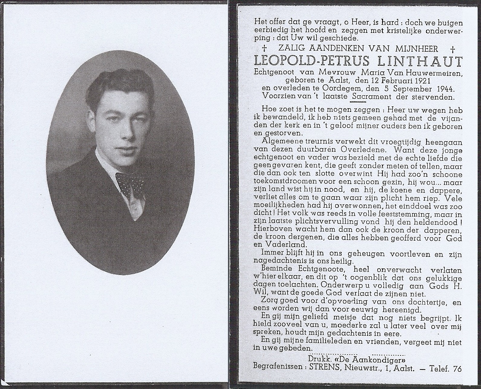 Leopold-Petrus Linthaut Geboren: 12 februari 1921 — Aalst Overleden: 5 september 1944 — Oordegem |