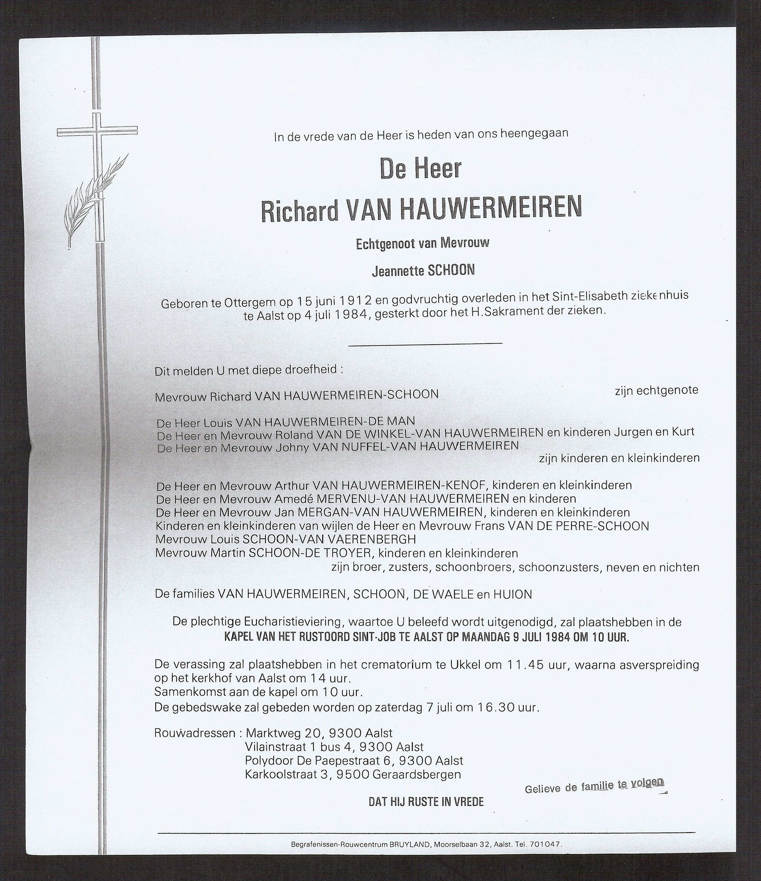 Richard Van Hauwermeiren Geboren: 15 juni 1912 25 27 — Ottergem Overleden: 4 juli 1984 — Aalst |