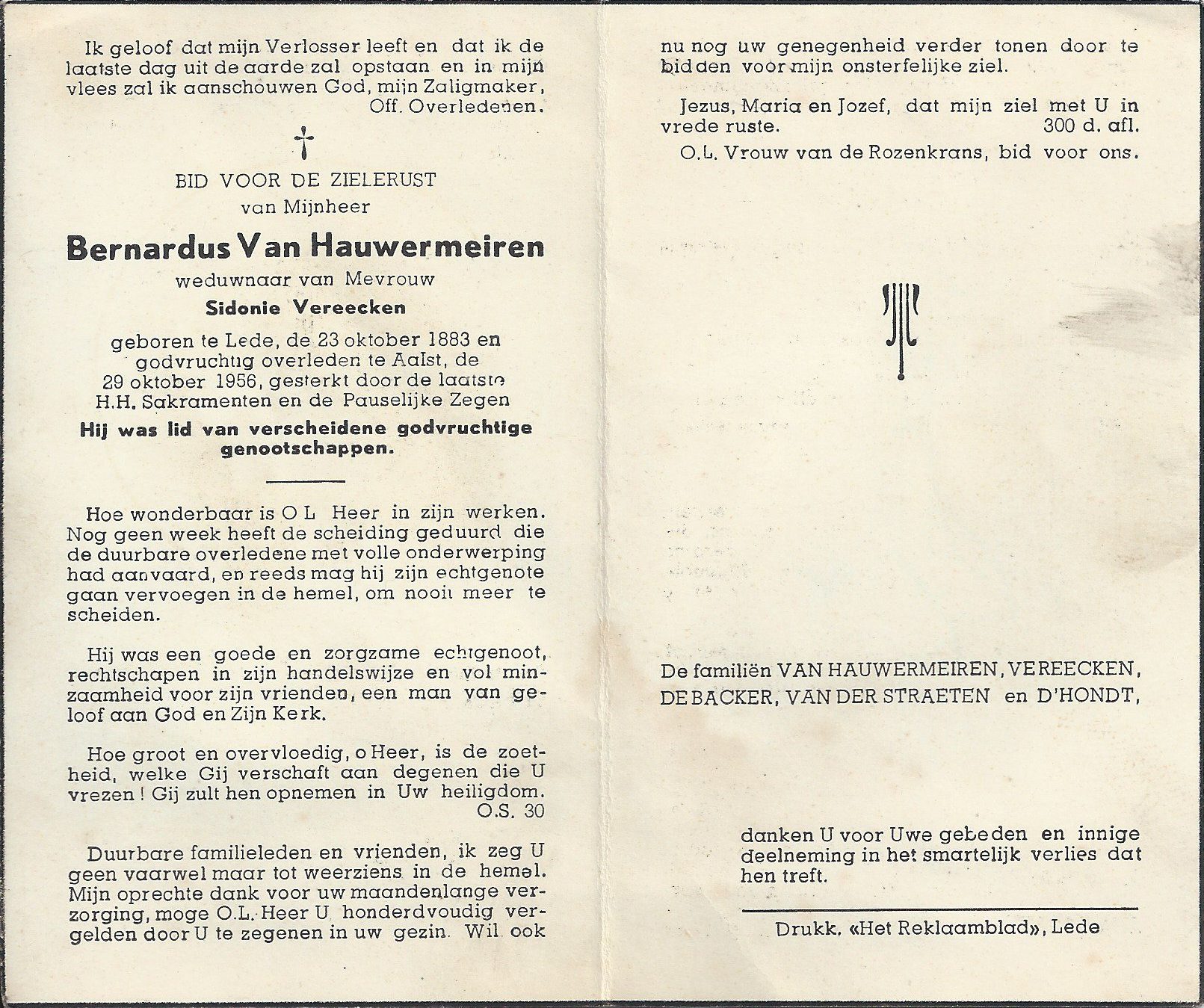 Bernardus Van Hauwermeiren Geboren: 23 oktober 1883 38 33 — Lede Overleden: 29 oktober 1956 — Aalst |