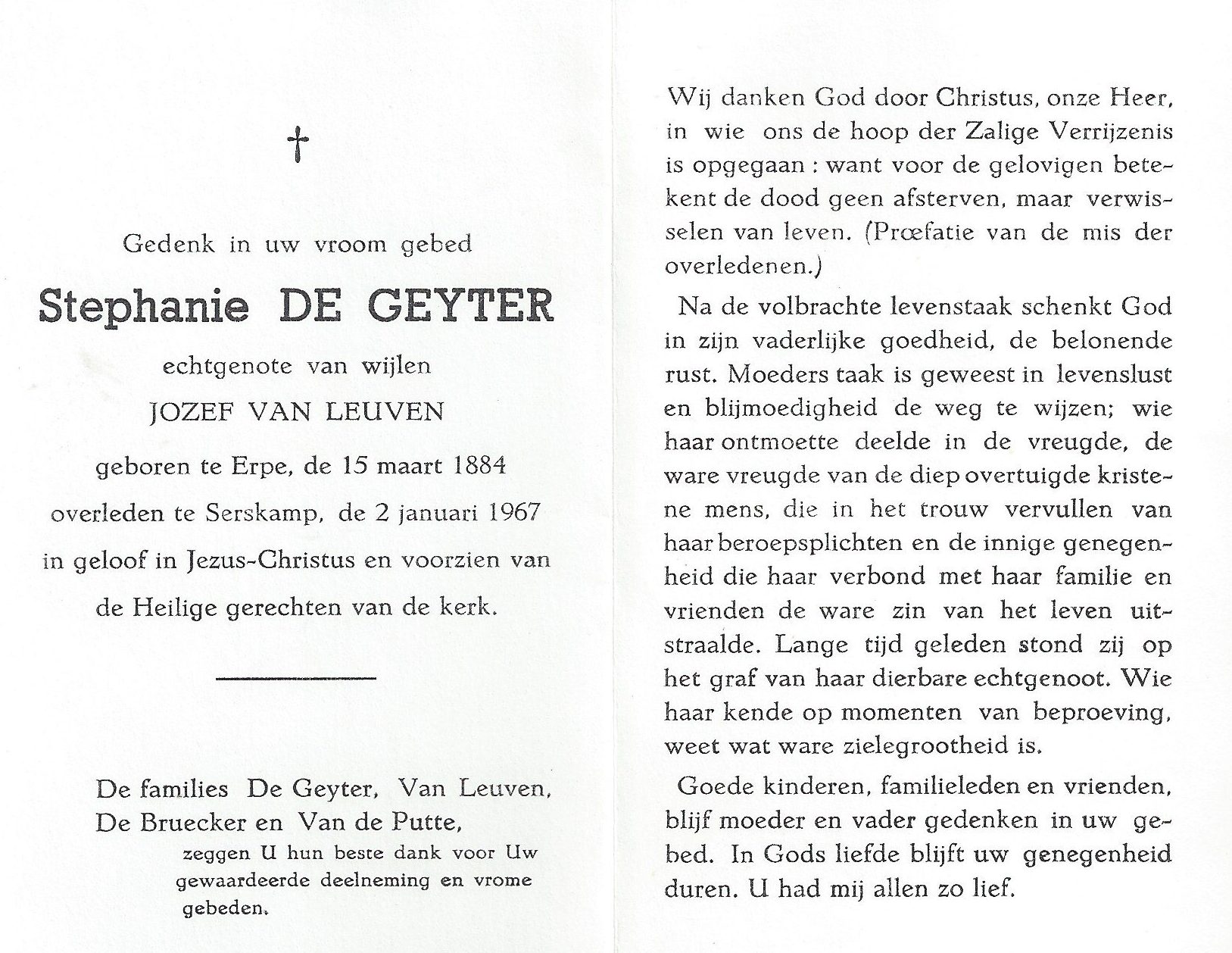 Maria Stephania De Geyter Geboren: 15 maart 1884 28 32 — Erpe Overleden: 2 januari 1967 — Serskamp |