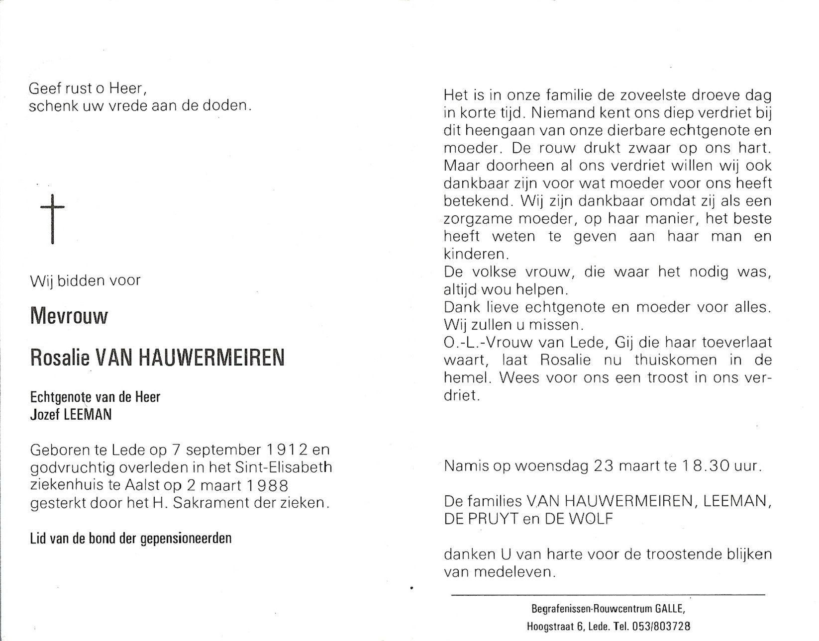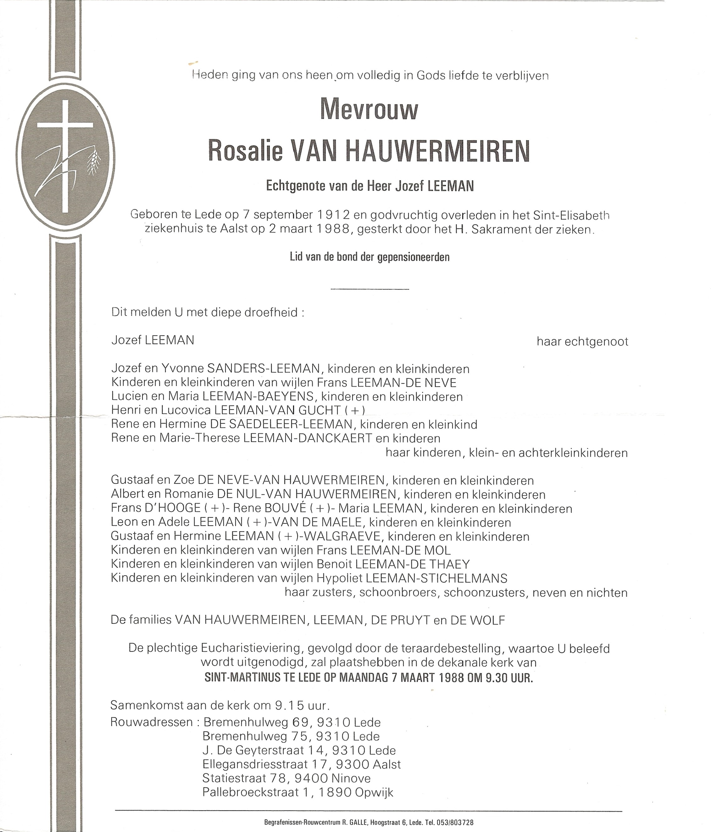 Rosalie Van Hauwermeiren Geboren: 7 september 1912 15 24 — Lede Overleden: 2 maart 1988 — Aalst |