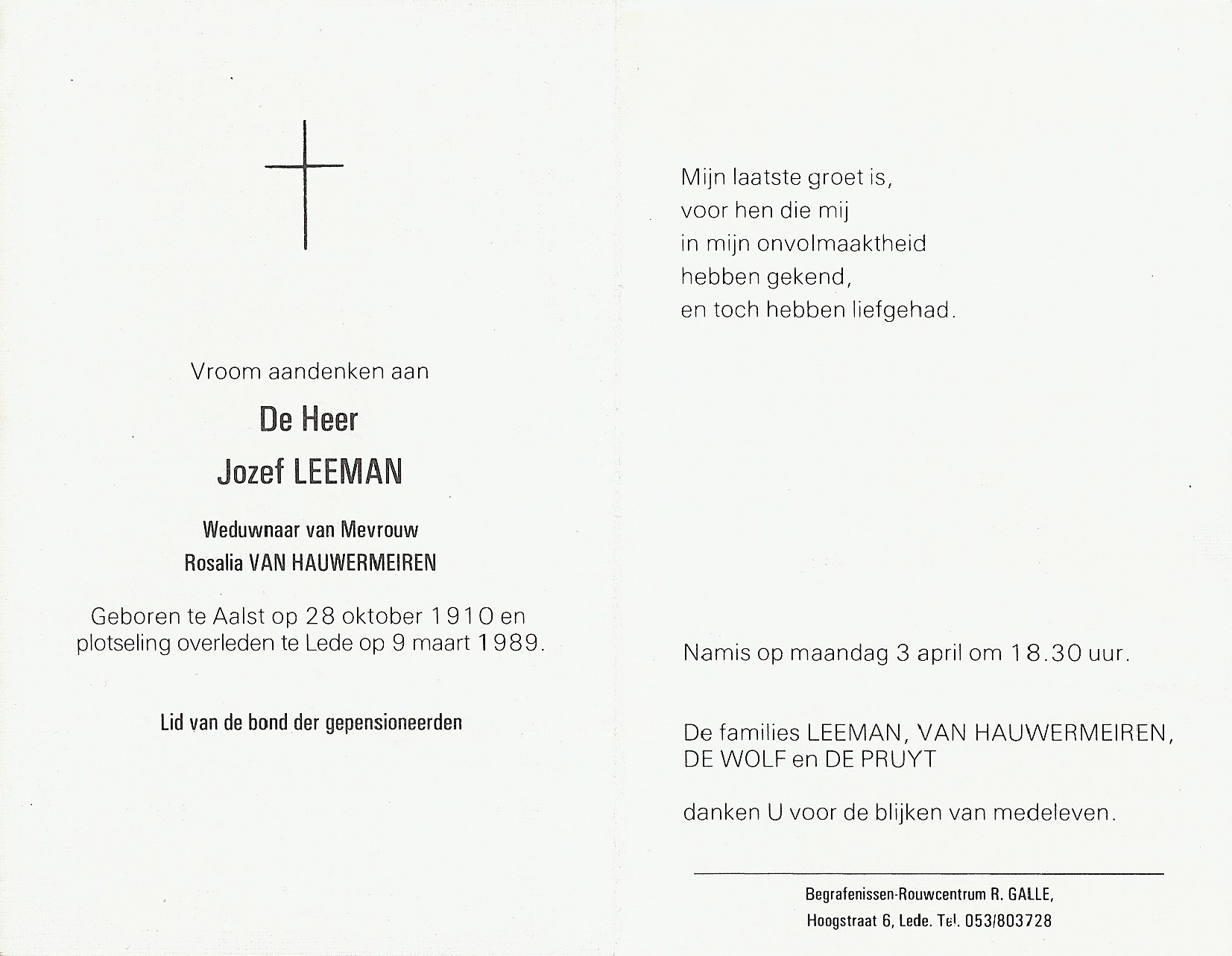 Jozef Sylvia Leeman Geboren: 28 oktober 1910 — Aalst Overleden: 9 maart 1989 — Lede |
