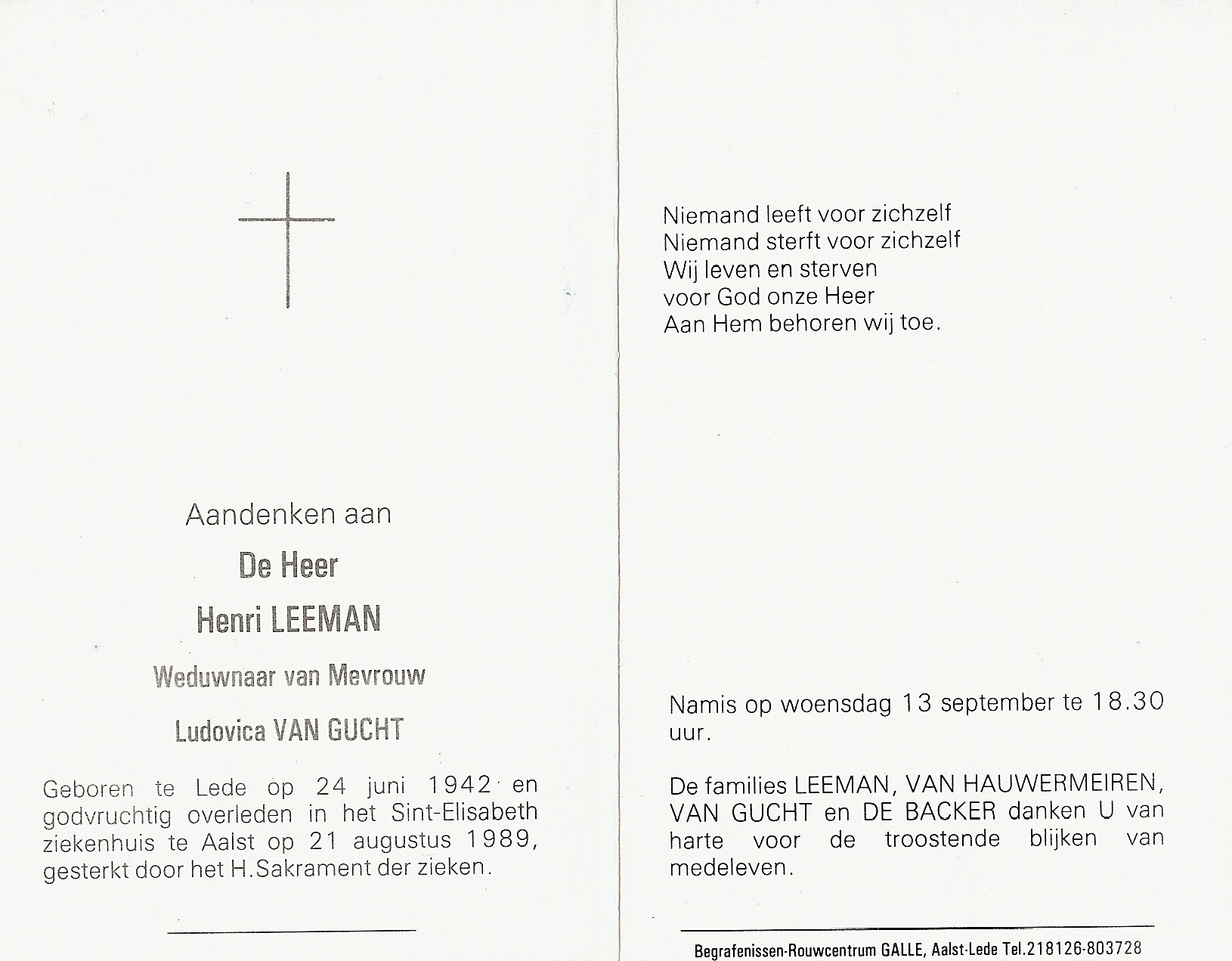 Henri Leeman Geboren: 24 juni 1942 31 29 — Lede Overleden: 21 augustus 1989 — Aalst |