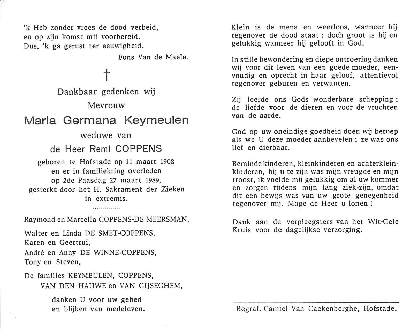 Maria Germana Keymeulen Geboren: 11 maart 1908 26 25 — Hofstade Overleden: 27 maart 1989 — Hofstade |