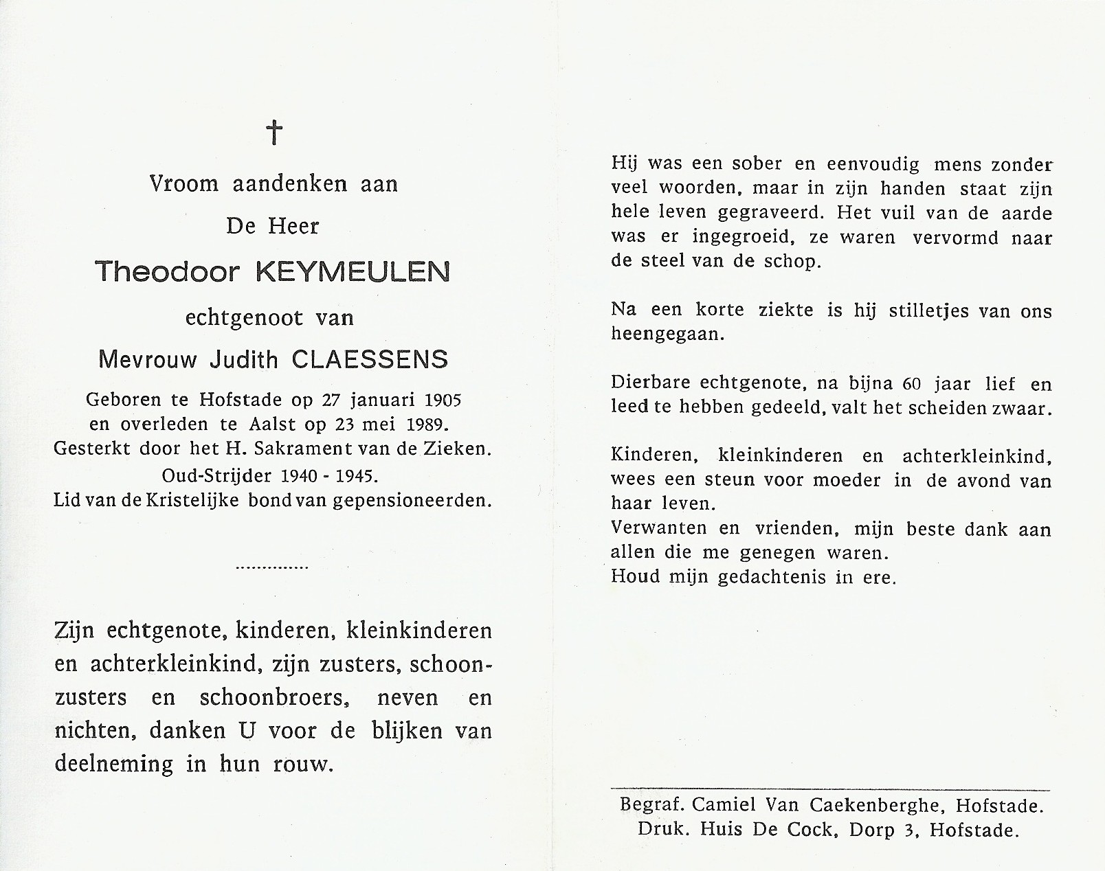 Theodoor Keymeulen Geboren: 27 januari 1905 22 22 — Hofstade Overleden: 23 mei 1989 — Aalst |