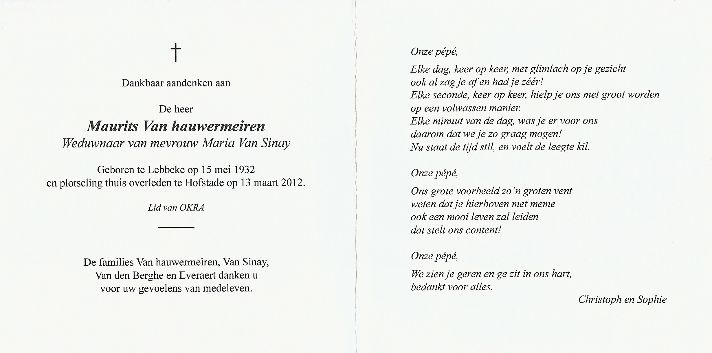 Maurits Van Hauwermeiren Geboren: 15 mei 1932 28 26 — Lebbeke Overleden: 13 maart 2012 — Hofstade |