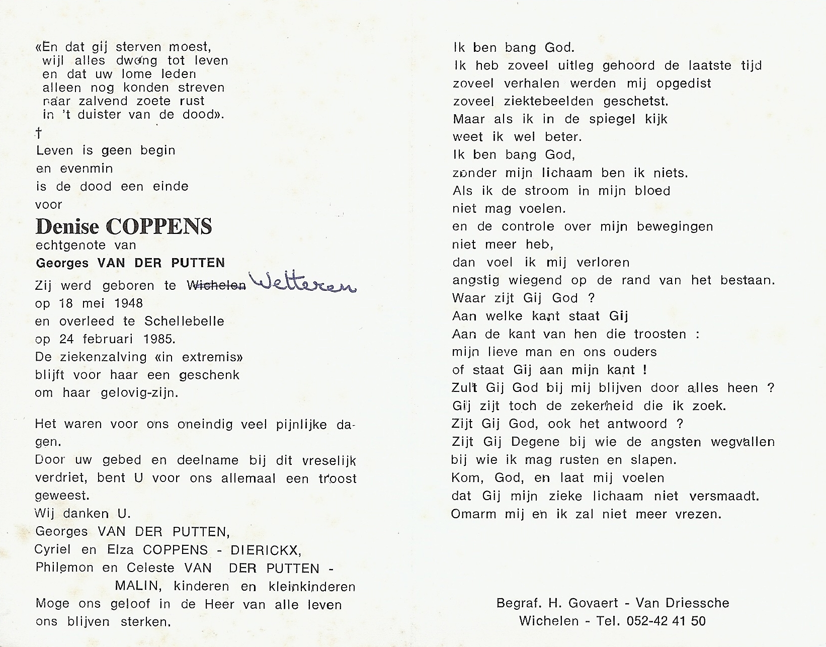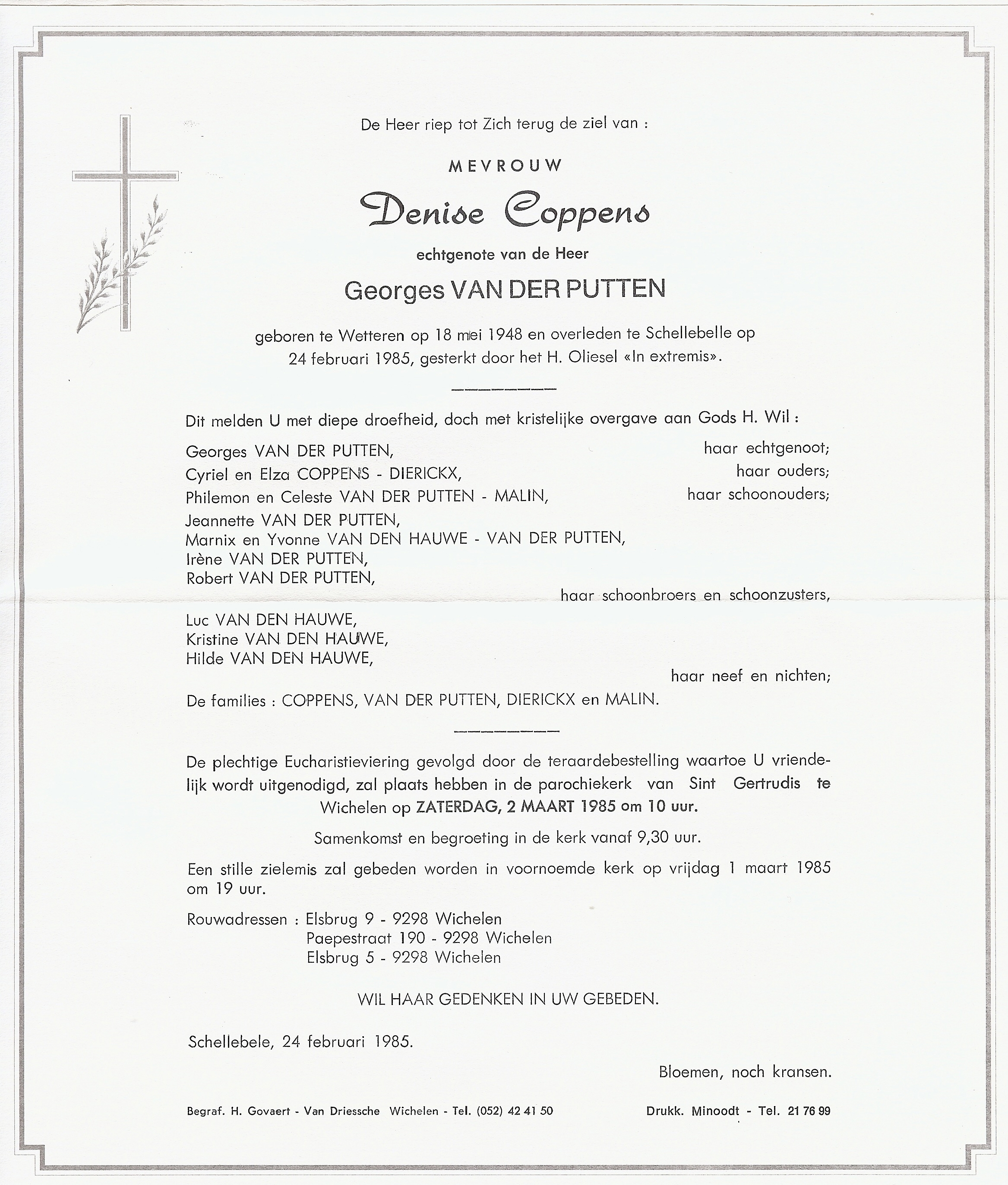 Denise Agnes Coppens Geboren: 18 mei 1948 — Wetteren Overleden: 24 februari 1985 — Schellebelle |