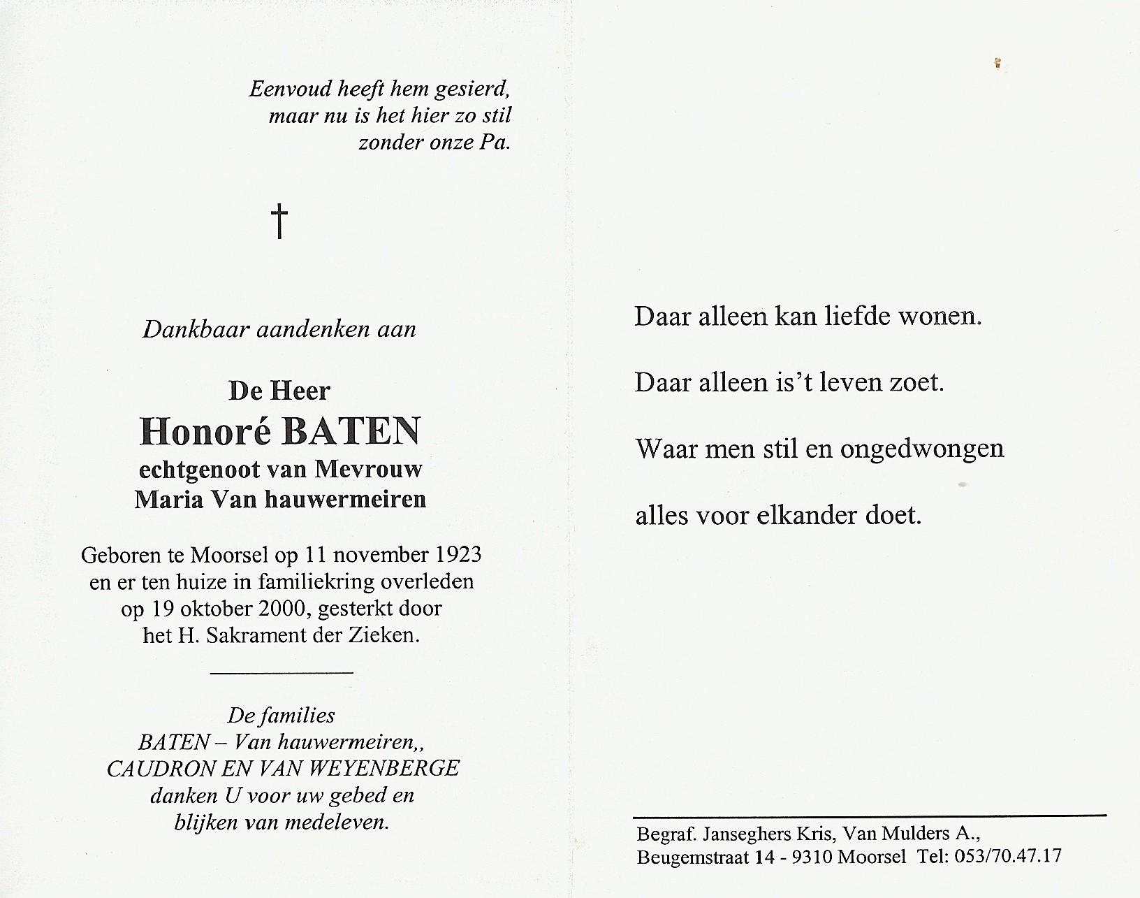 Honoré Baten Geboren: 11 november 1923 — Moorsel Overleden: 19 oktober 2000 — Moorsel |