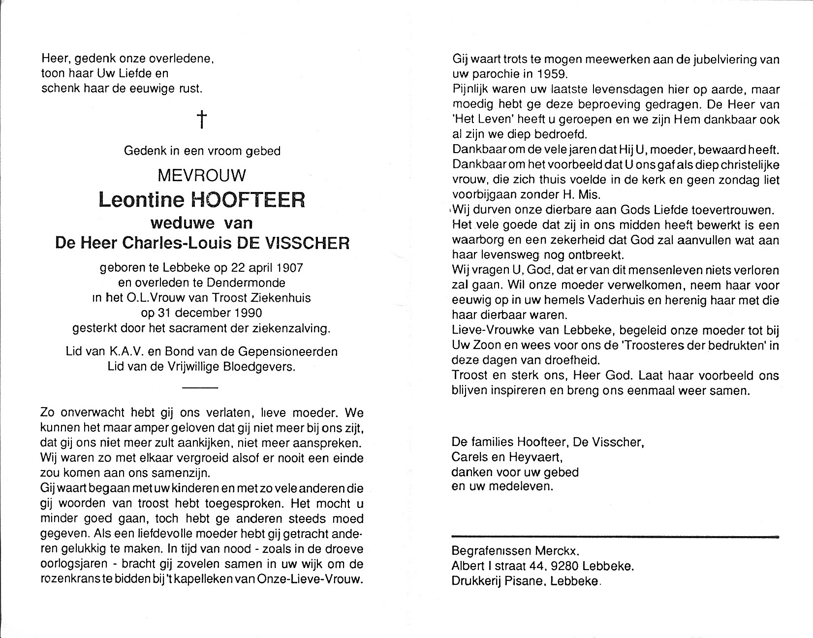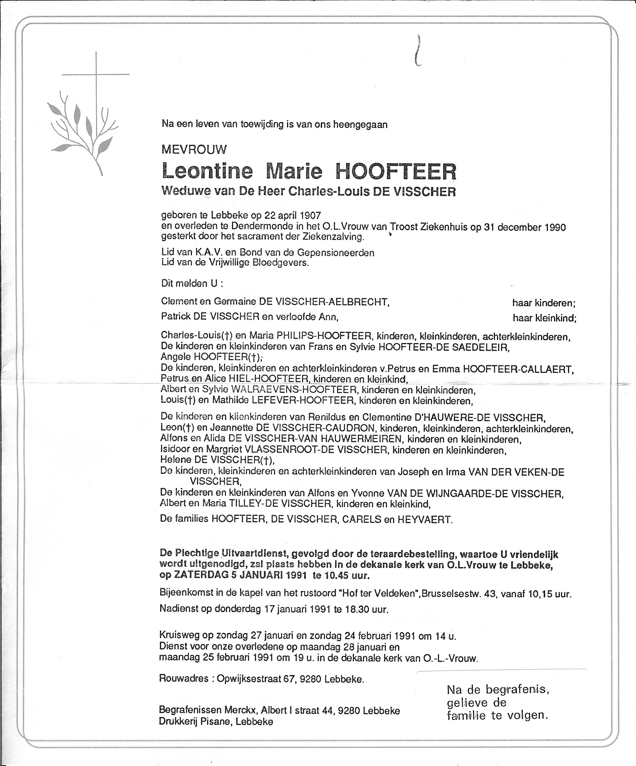 Leontine Marie Hoofteer Geboren: 22 april 1907 — Lebbeke Overleden: 31 december 1990 — Dendermonde |