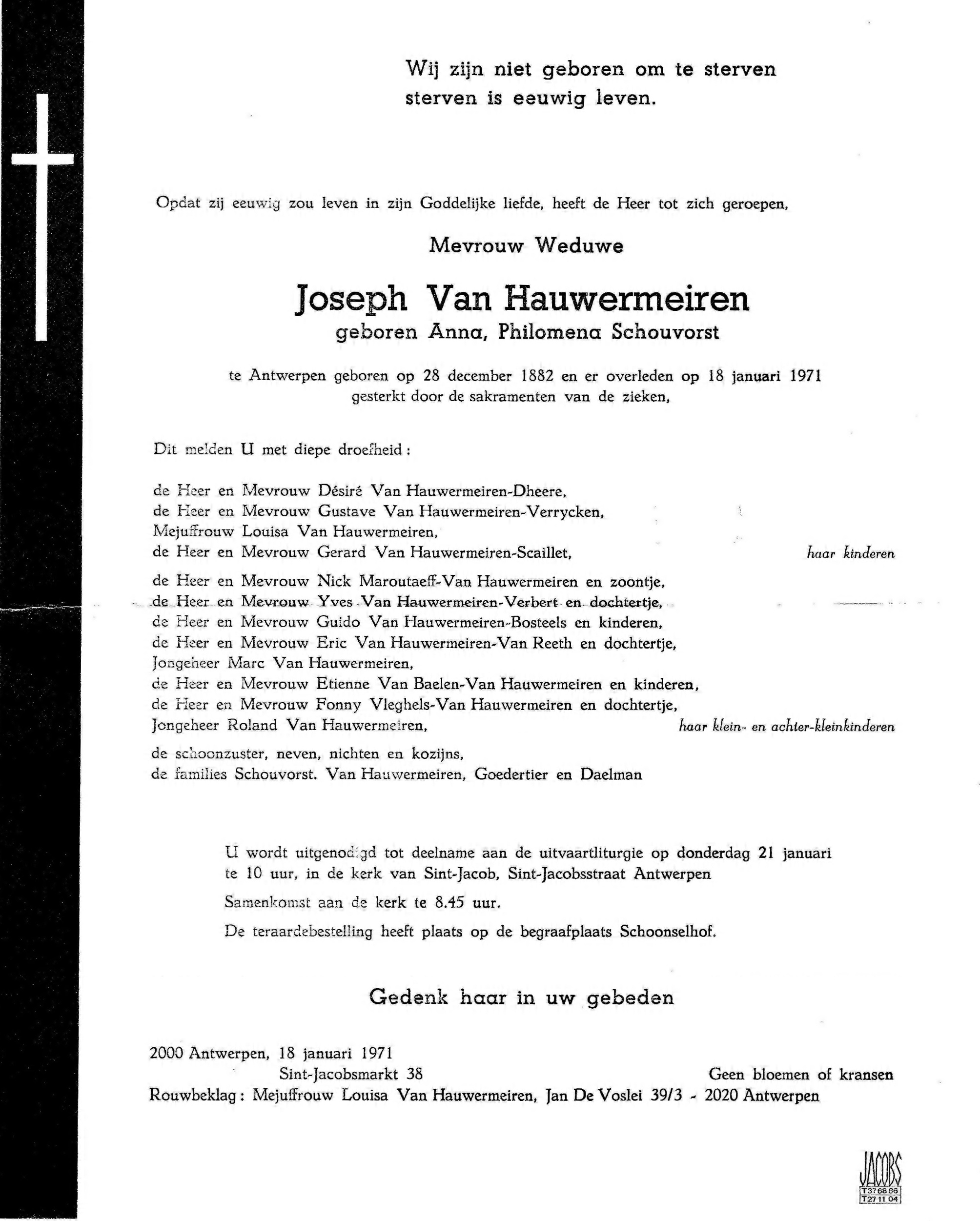 Overlijden van een echtgenoot | Joseph Van Hauwermeiren 11 april 1946 (Leeftijd 63 jaar) |