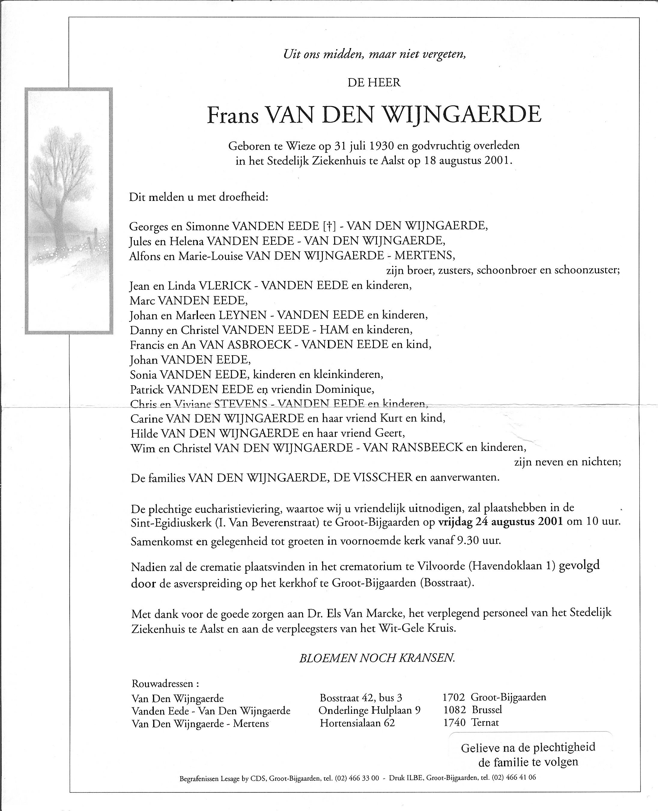 Frans Van Den Wijngaerde Geboren: 31 juli 1930 24 23 — Wieze Overleden: 18 augustus 2001 — Aalst |