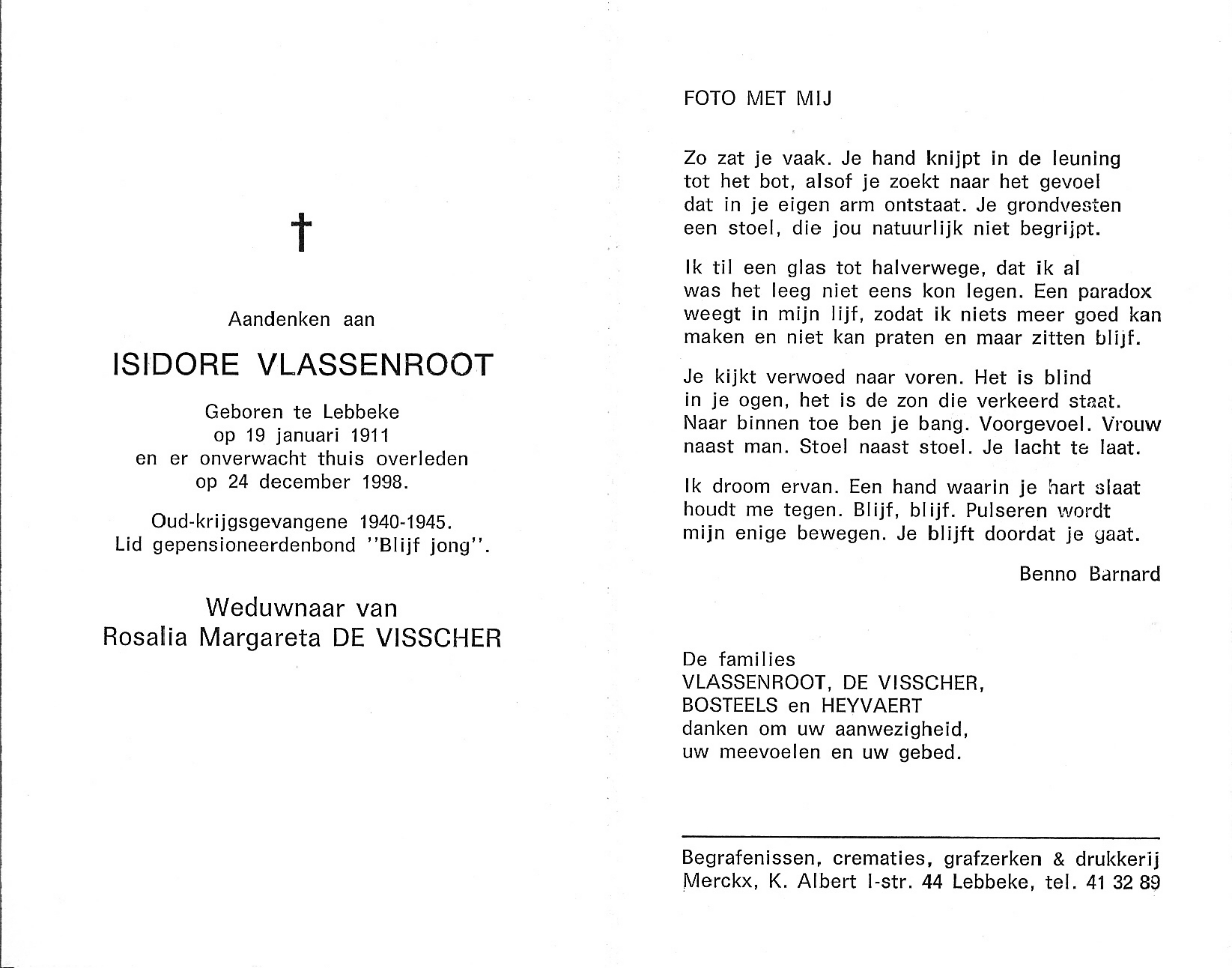 Isidore Vlassenroot Geboren: 19 januari 1911 — Lebbeke Overleden: 24 december 1998 — Lebbeke |