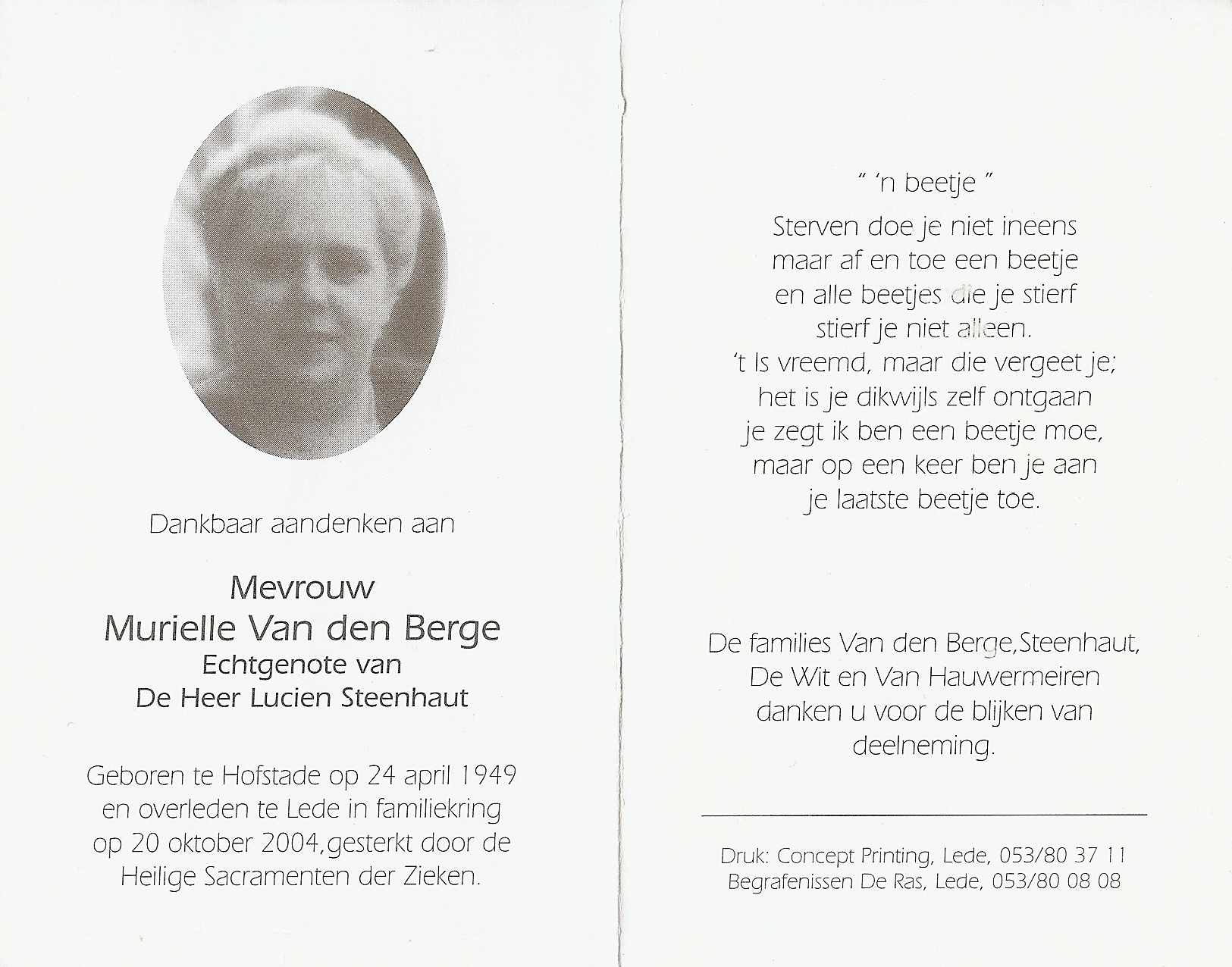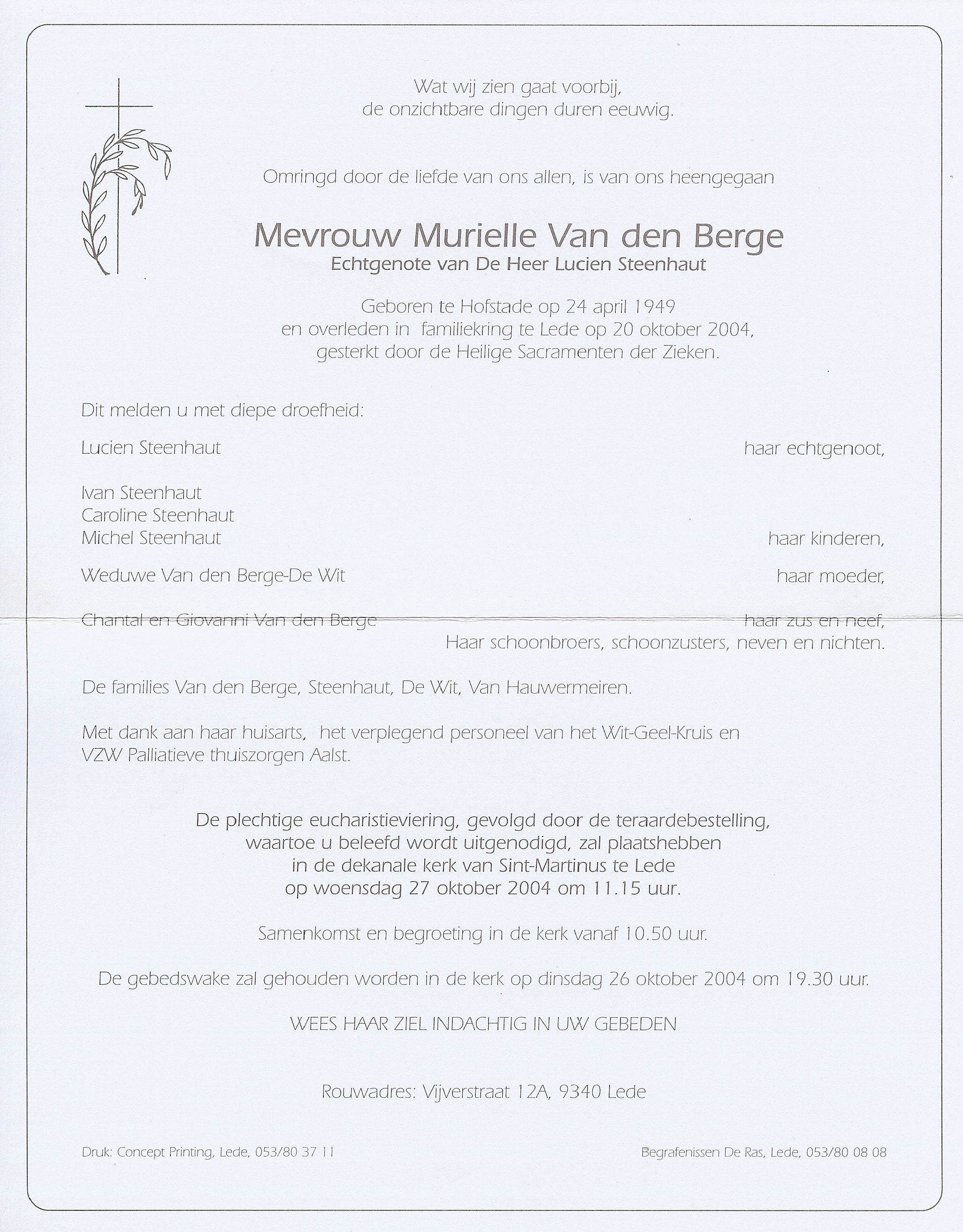 Murielle Pierre Marie Van den Berge Geboren: 24 april 1949 — Hofstade Overleden: 20 oktober 2004 — Lede |