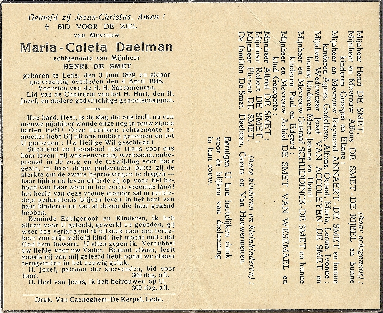 Maria-Coleta Daelman Geboren: 3 juni 1879 — Lede Overleden: 4 april 1945 — Lede |