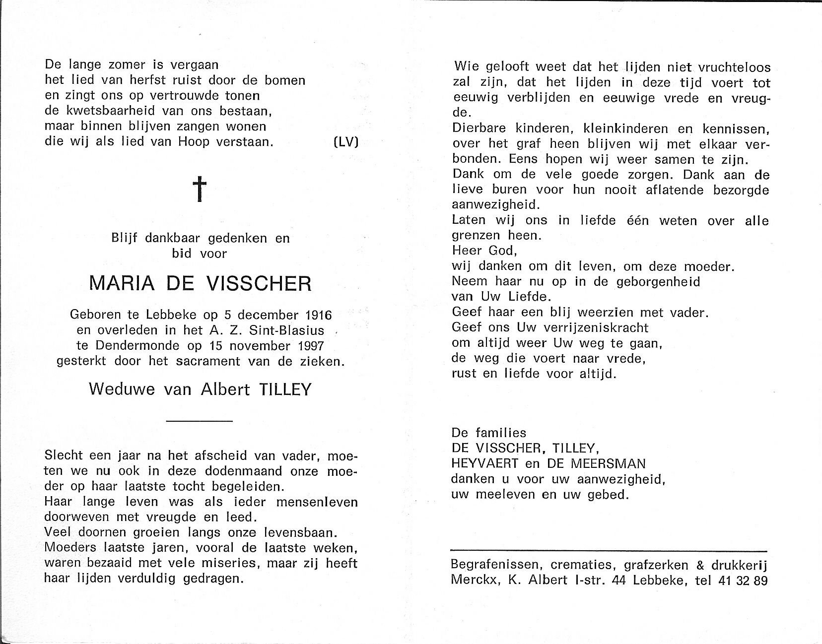 Overlijden van een zus | Maria Helena De Visscher 19 februari 1950 (Leeftijd 33 jaar) |
