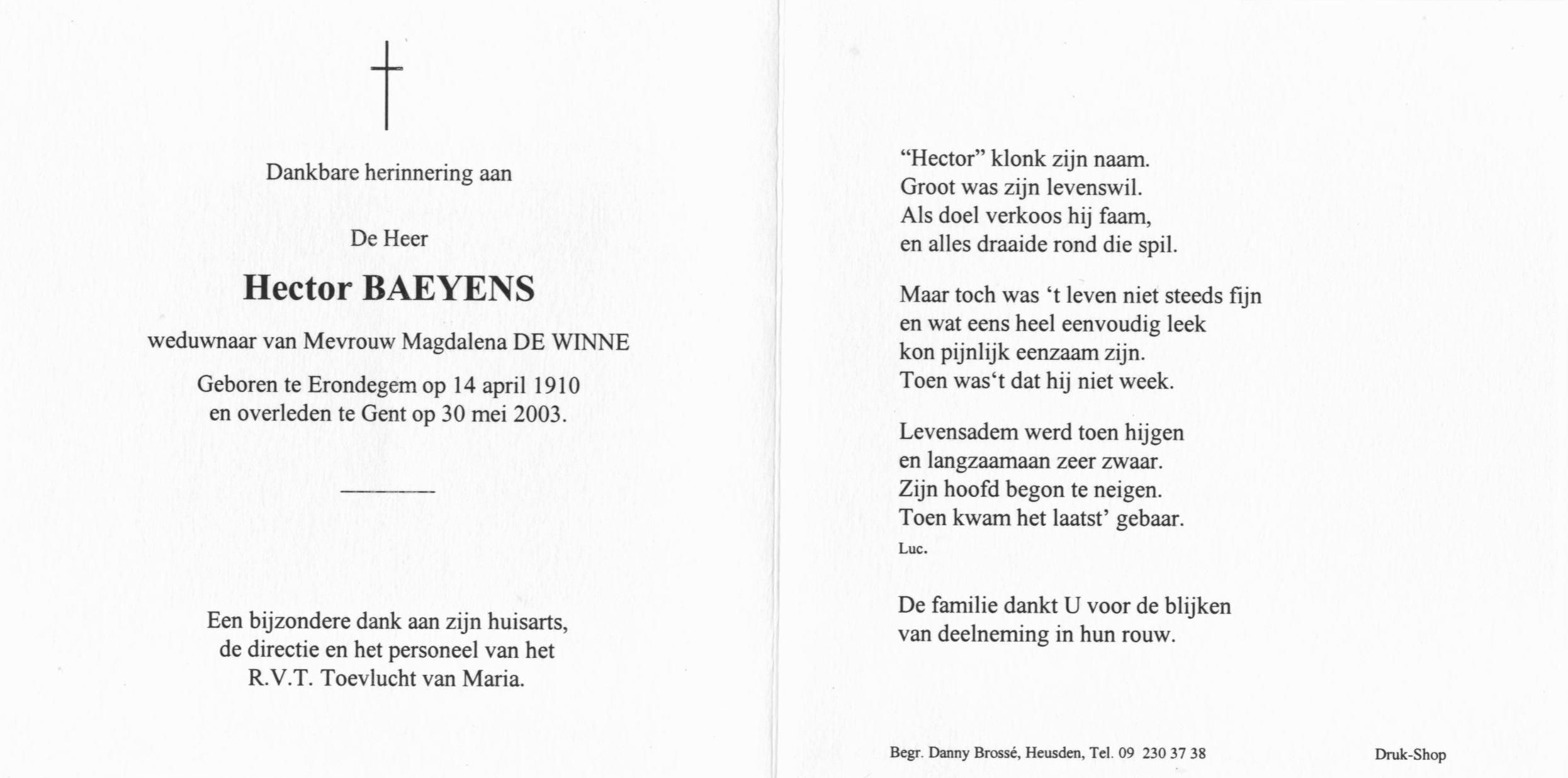 Hector Eugene Baeyens Geboren: 14 april 1910 26 33 — Erondegem Overleden: 30 mei 2003 — Gent |