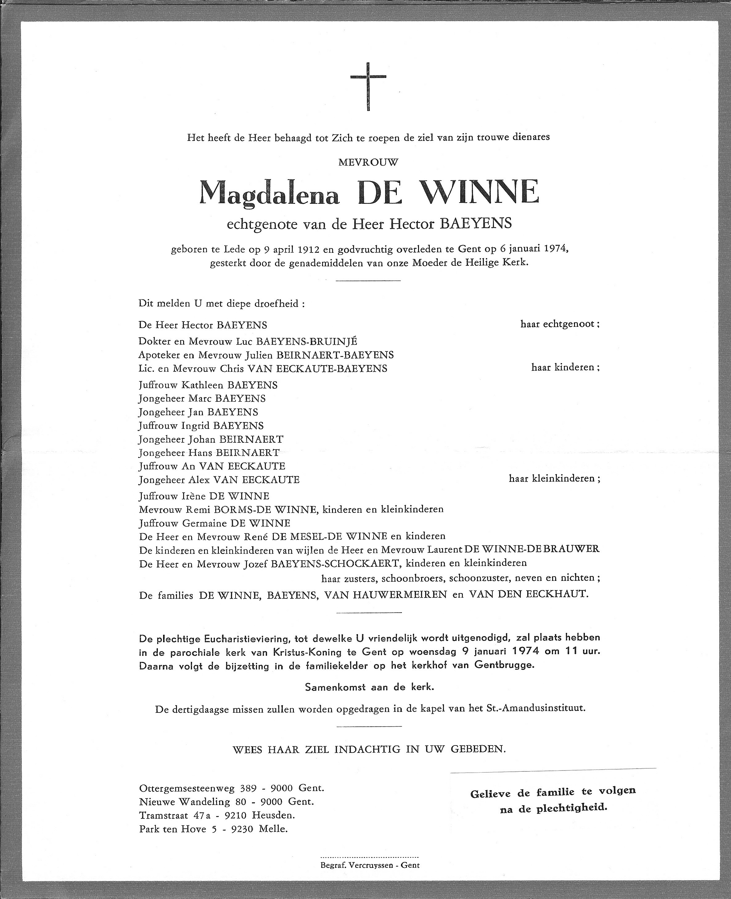 Begrafenis van een echtgenote | Magdalena De Winne 9 januari 1974 (Leeftijd 63 jaar) |