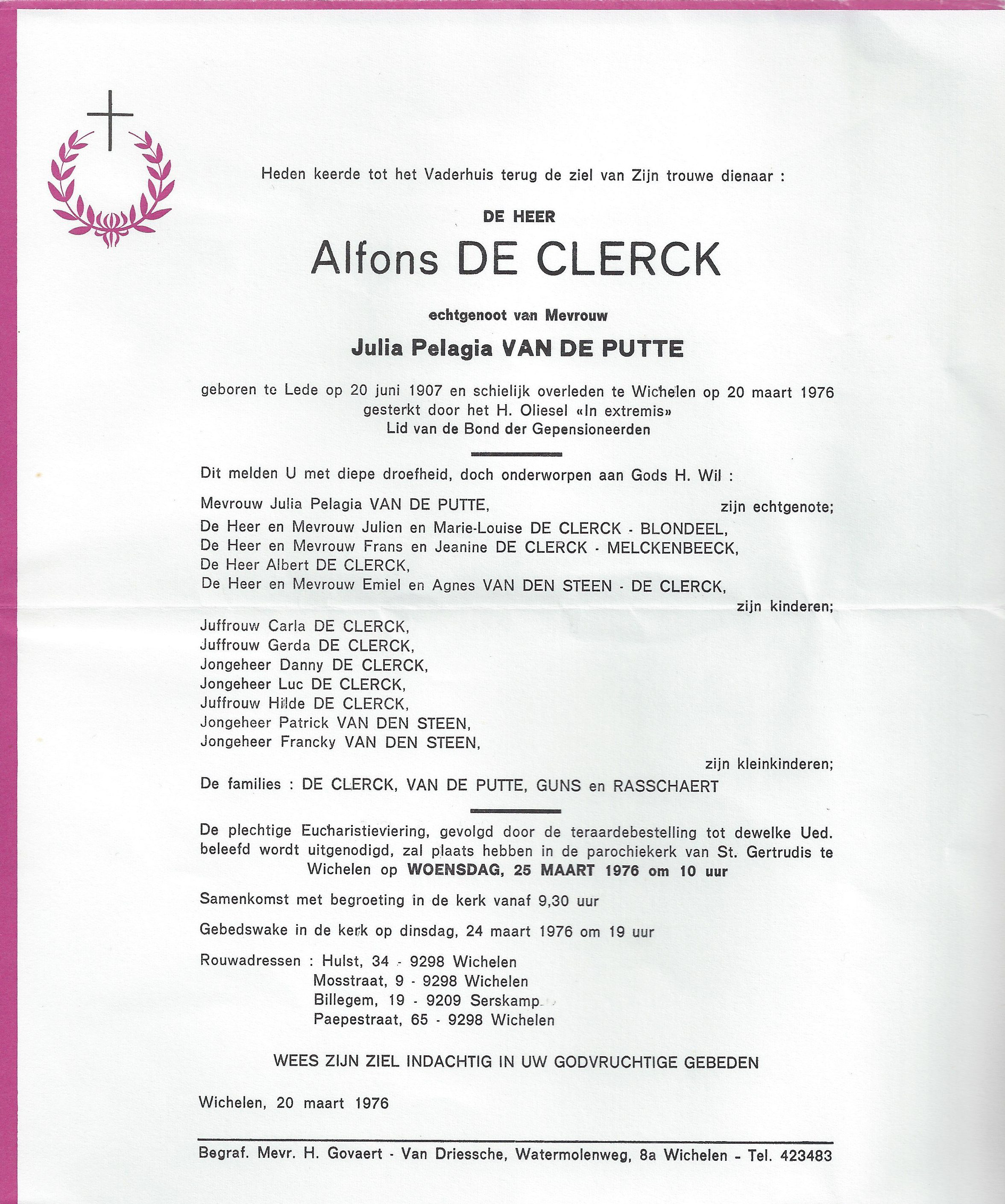 Overlijden van een zoon | Alfons De Clerck 20 maart 1976 |
