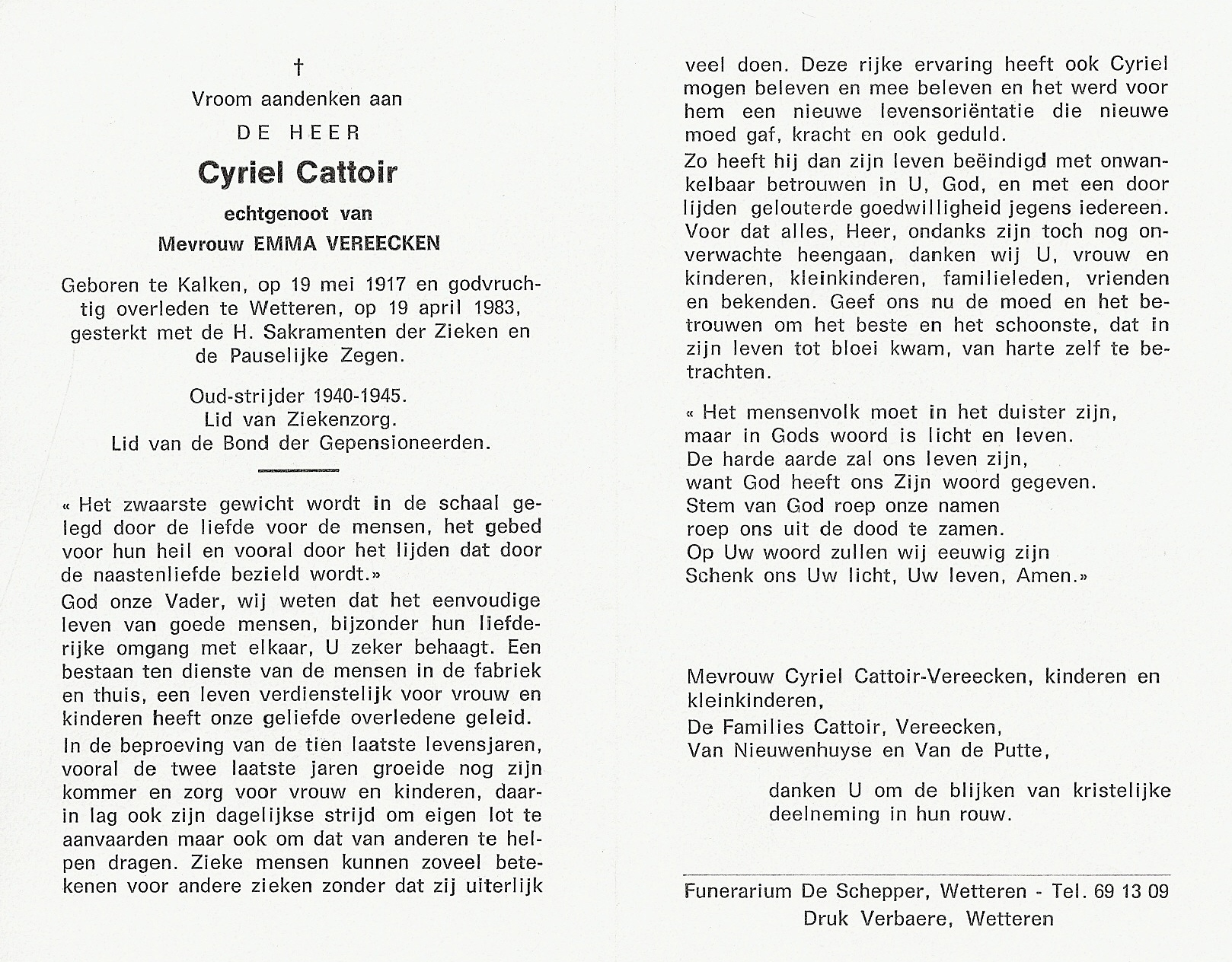 Cyriel Cattoir Geboren: 19 mei 1917 — Kalken Overleden: 19 april 1983 — Wetteren |