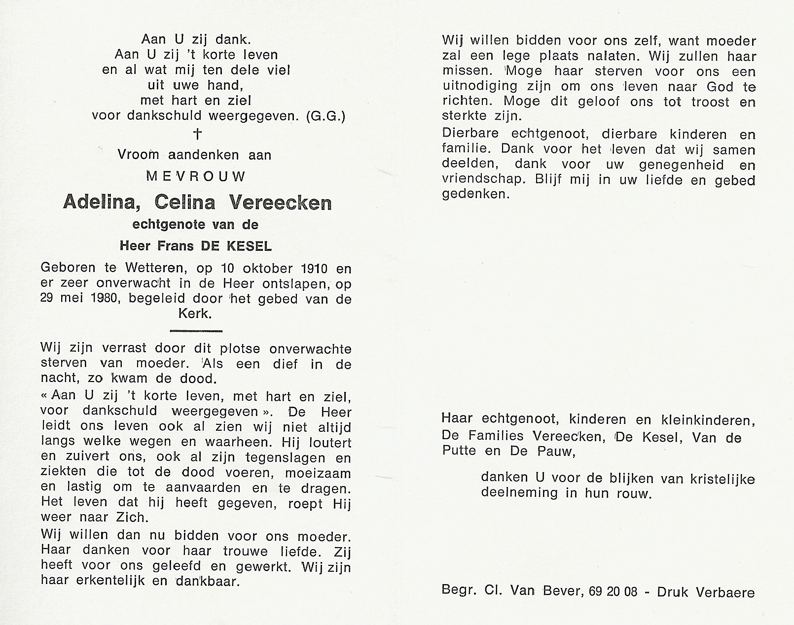 Adelina Celina Vereecken Geboren: 10 oktober 1910 24 25 — Wetteren Overleden: 29 mei 1980 — Wetteren |