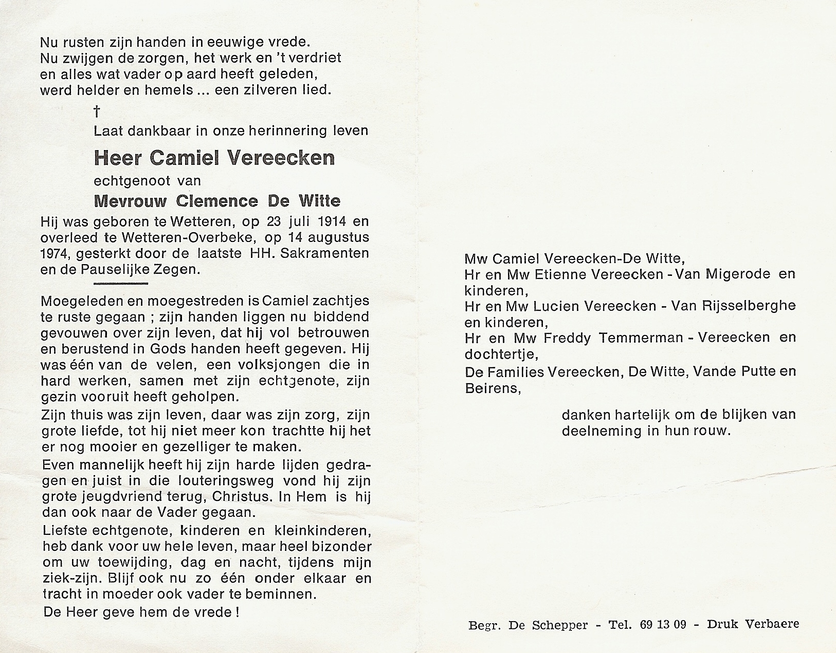 Camiel Vereecken Geboren: 23 juli 1914 28 29 — Wetteren Overleden: 14 augustus 1974 — Wetteren-Overbeke |