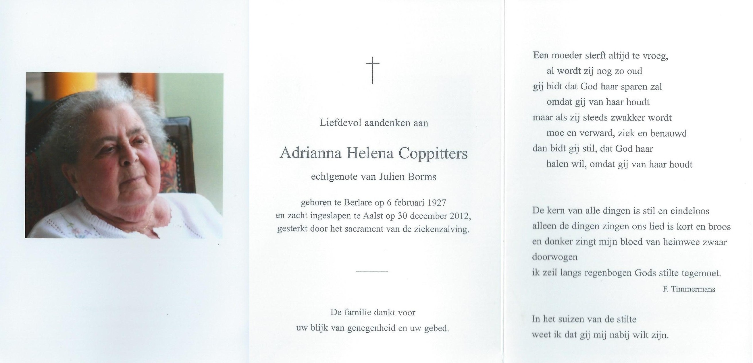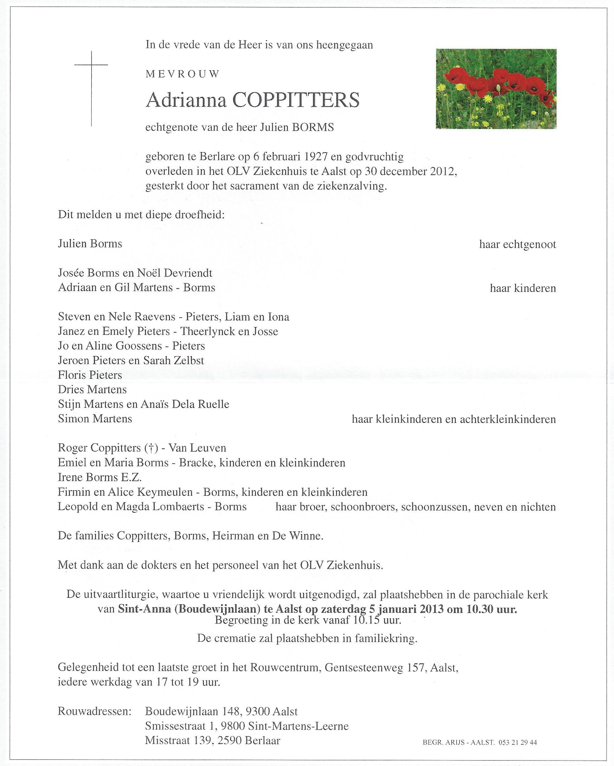 Overlijden van een echtgenote | Adriana Coppitters 30 december 2012 (Leeftijd 85 jaar) |