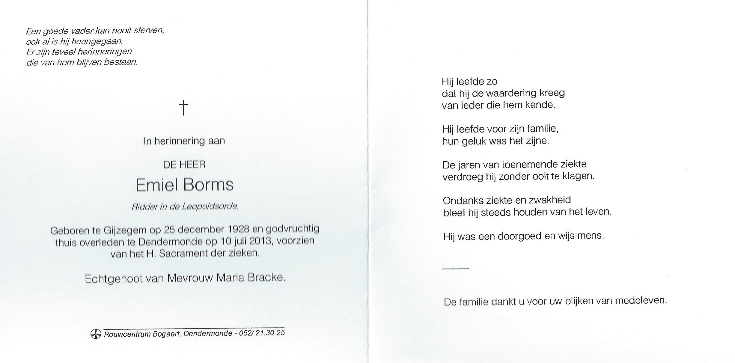 Leo Remigius Borms Geboren: 12 september 1902 52 36 — Gijzegem Overleden: 2 juni 1965 — Gijzegem |