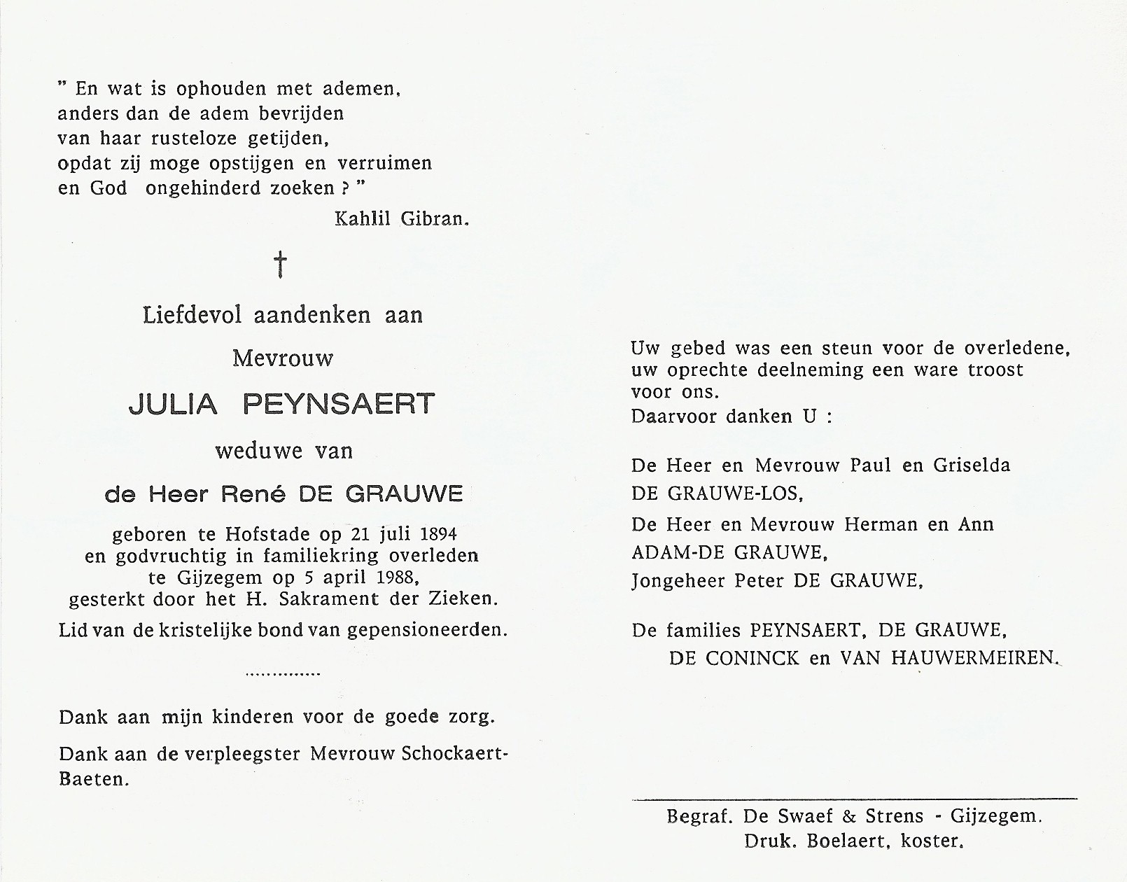 Overlijden van een echtgenote | Julia Peynsaert 5 april 1988 (Leeftijd 95 jaar) |