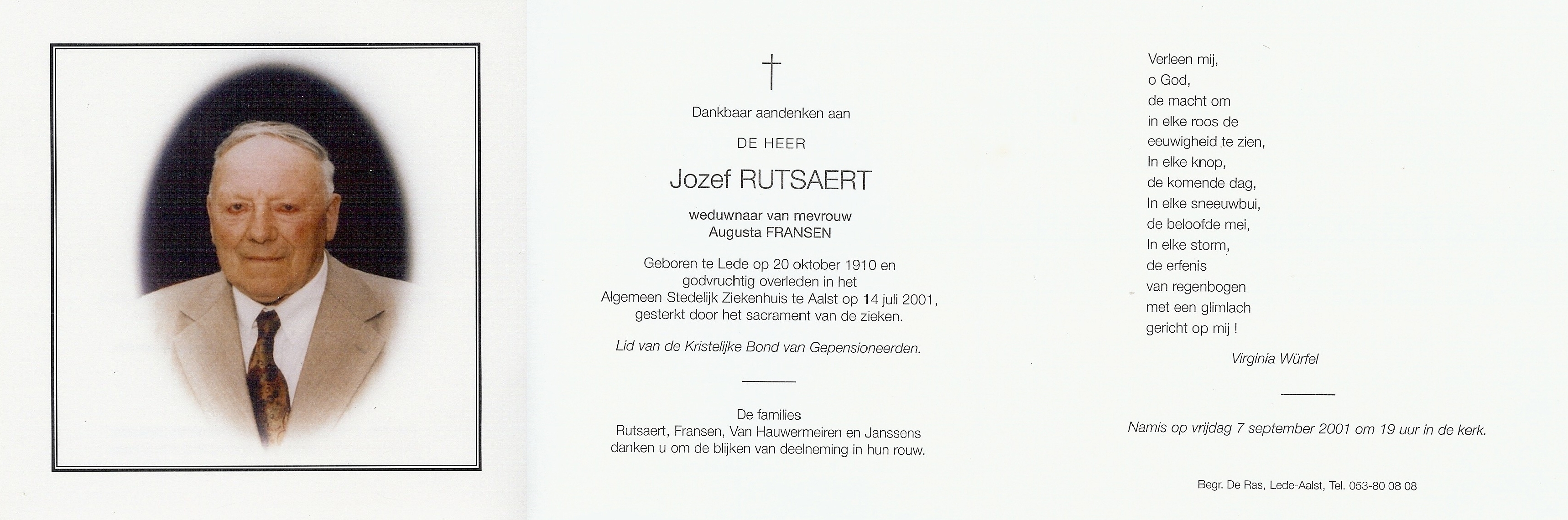 Jozef Rutsaert Geboren: 20 oktober 1910 27 25 — Lede Overleden: 14 juli 2001 — Aalst |