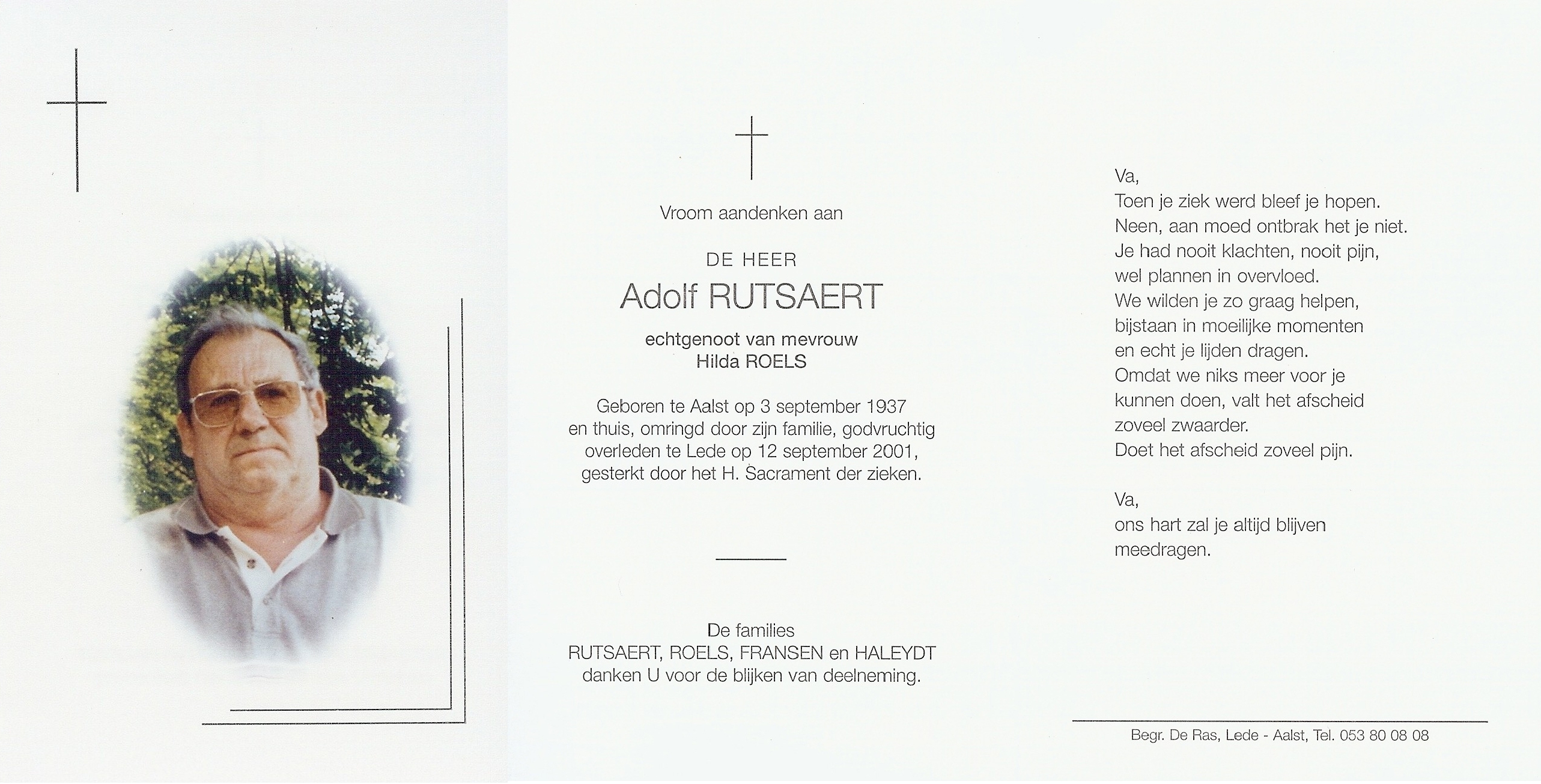 Adolf Rutsaert Geboren: 3 september 1937 26 24 — Aalst Overleden: 12 september 2001 — Lede |