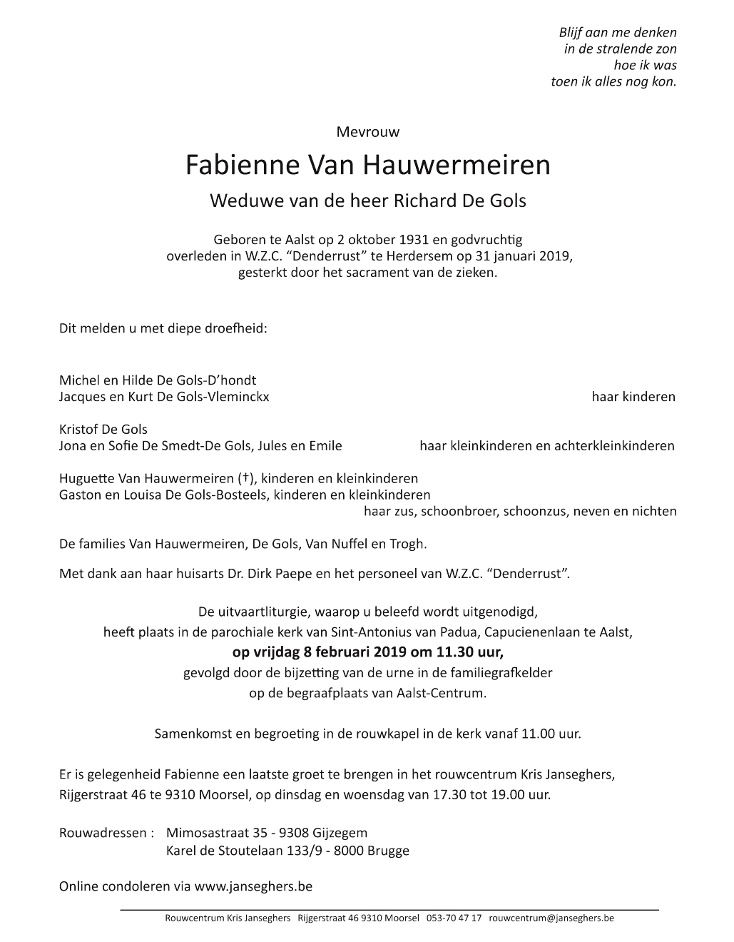Fabienne Van Hauwermeiren Geboren: 2 oktober 1931 24 21 — Aalst Overleden: 31 januari 2019 — Herdersem |