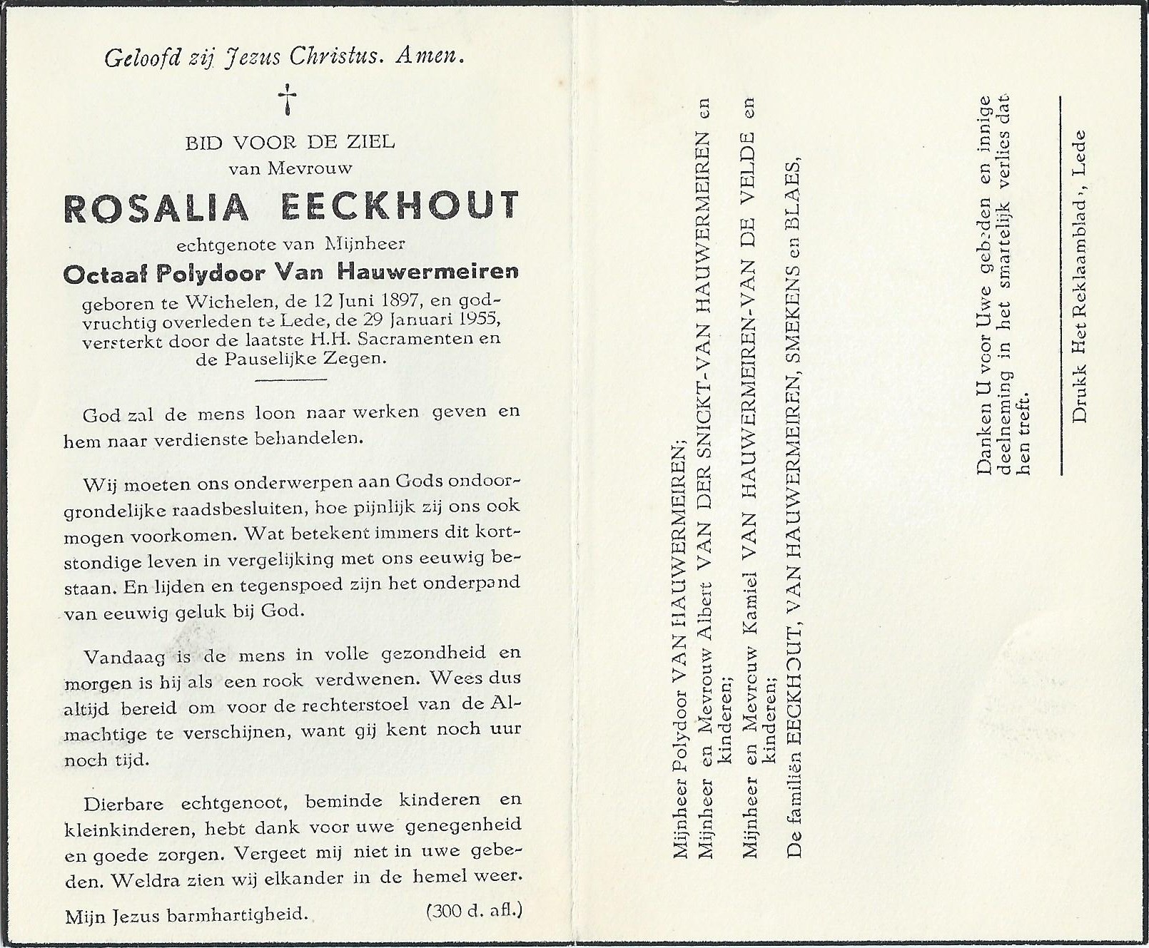 Rosalie Eeckhout Geboren: 12 juni 1897 — Wichelen Overleden: 29 januari 1955 — Lede |