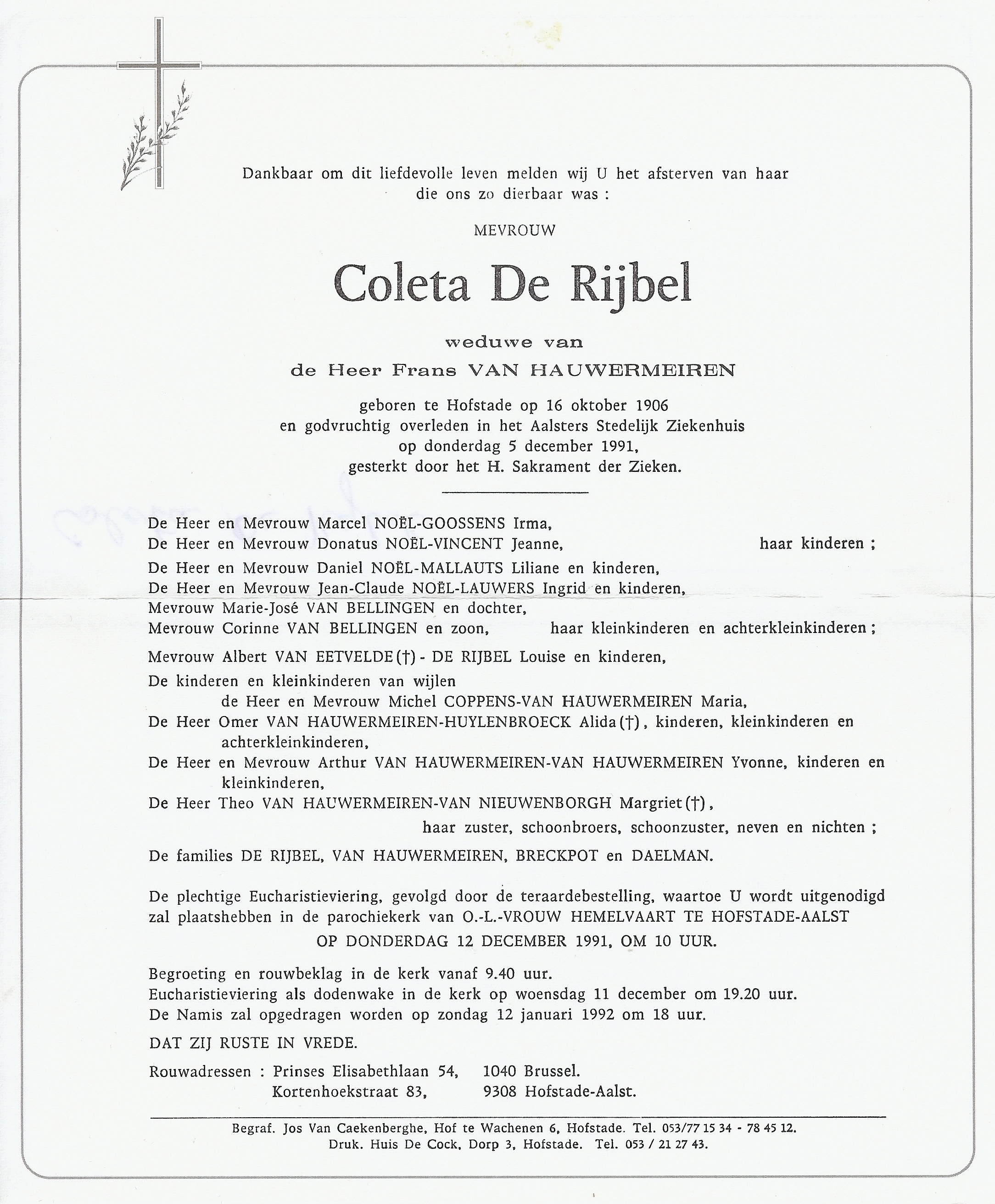 Coleta De Rijbel Geboren: 16 oktober 1906 — Hofstade Overleden: 5 december 1991 — Aalst |