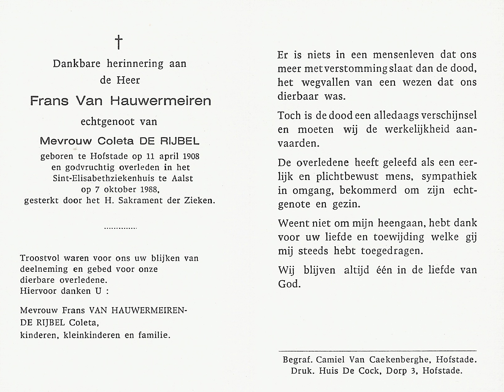 Begrafenis van een broer | Franciscus Xaverius Van Hauwermeiren 12 oktober 1988 (Leeftijd 78 jaar) |