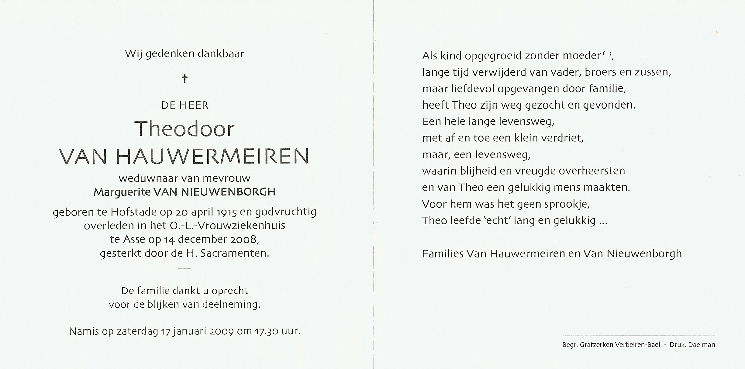Overlijden van een broer | Theodoor Van Hauwermeiren 14 december 2008 (Leeftijd 98 jaar) |