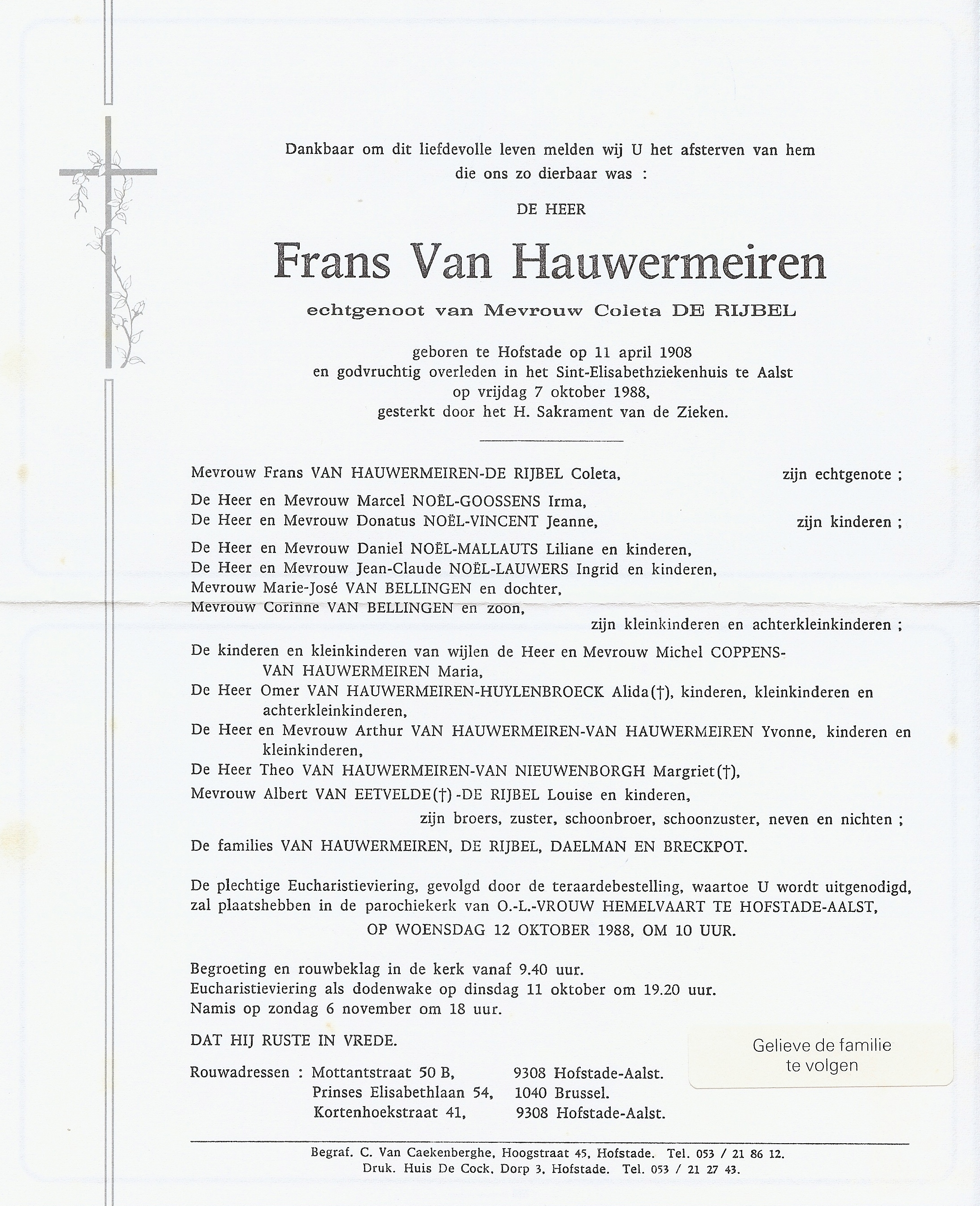 Overlijden van een broer | Franciscus Xaverius Van Hauwermeiren 7 oktober 1988 (Leeftijd 78 jaar) |