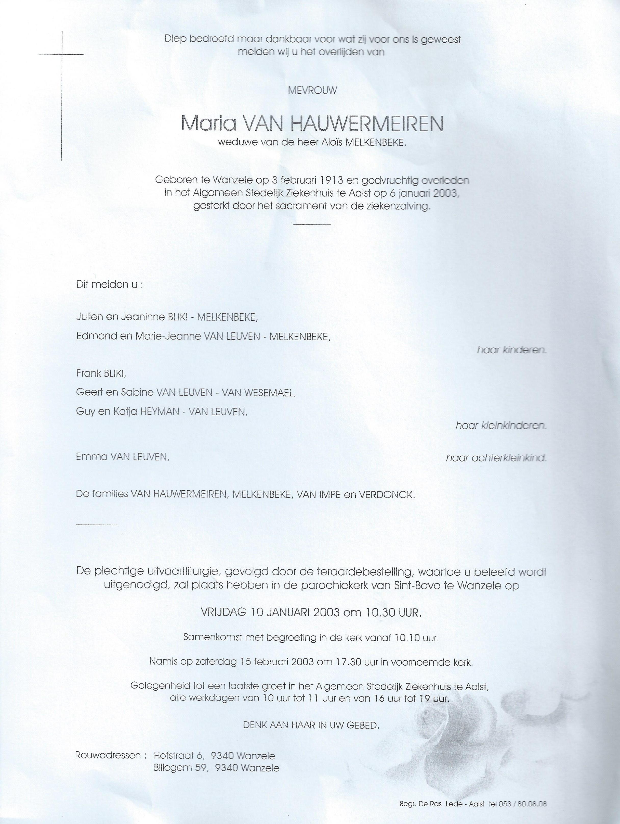 Maria Theresia Van Hauwermeiren Geboren: 3 februari 1913 26 25 — Wanzele Overleden: 6 januari 2003 — Aalst |