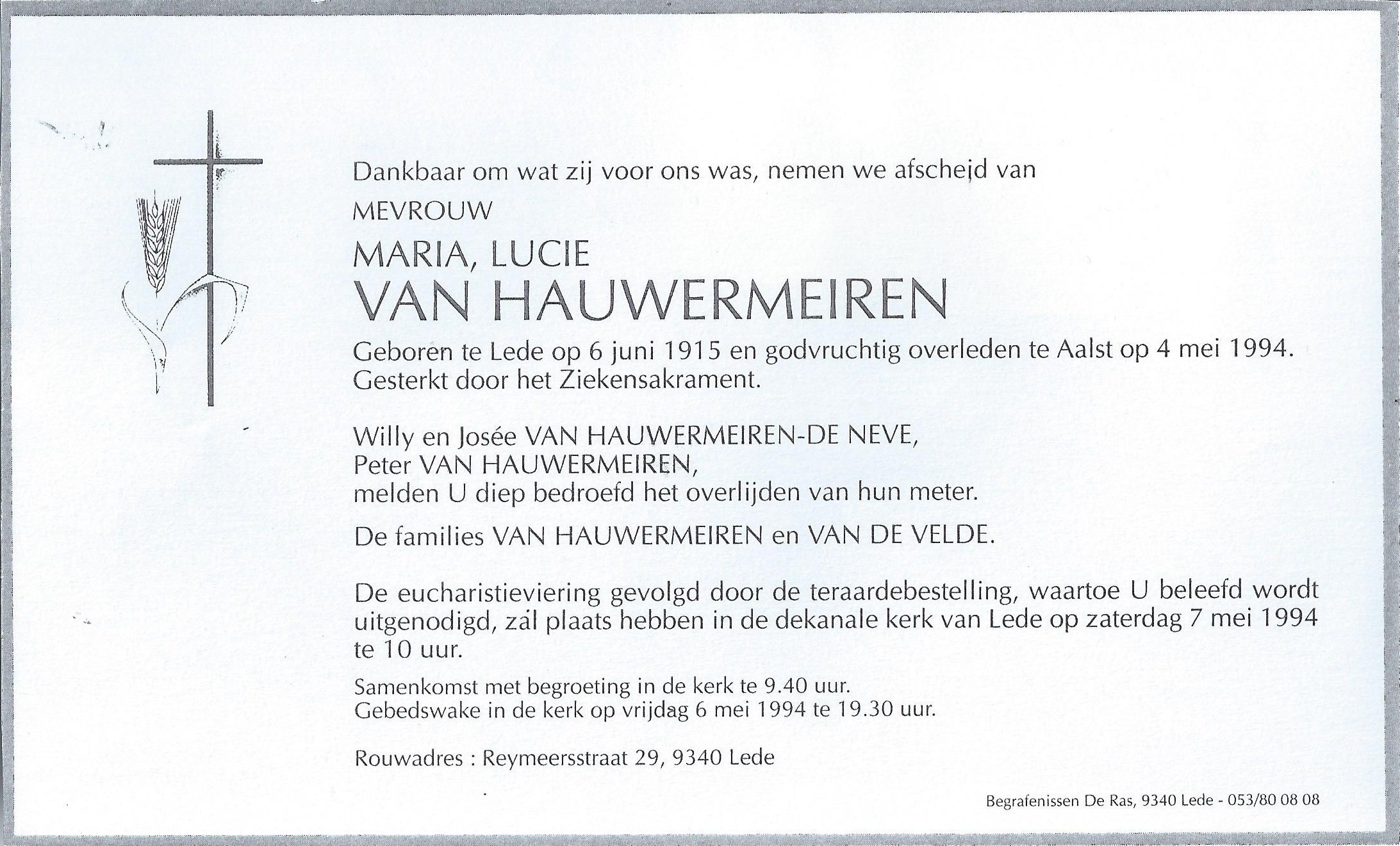 Lucie Maria Van Hauwermeiren Geboren: 6 juni 1915 37 30 — Lede Overleden: 4 mei 1994 — Aalst |