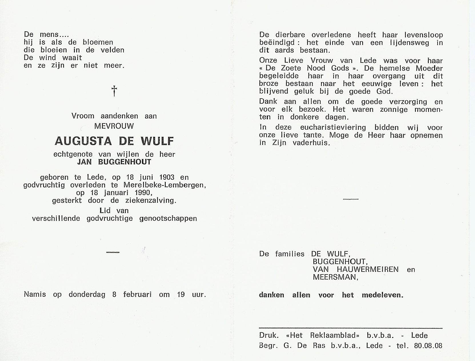 Augusta Georgine De Wulf Geboren: 18 juni 1903 42 39 — Lede Overleden: 18 januari 1990 — Merelbeke-Lembergen |