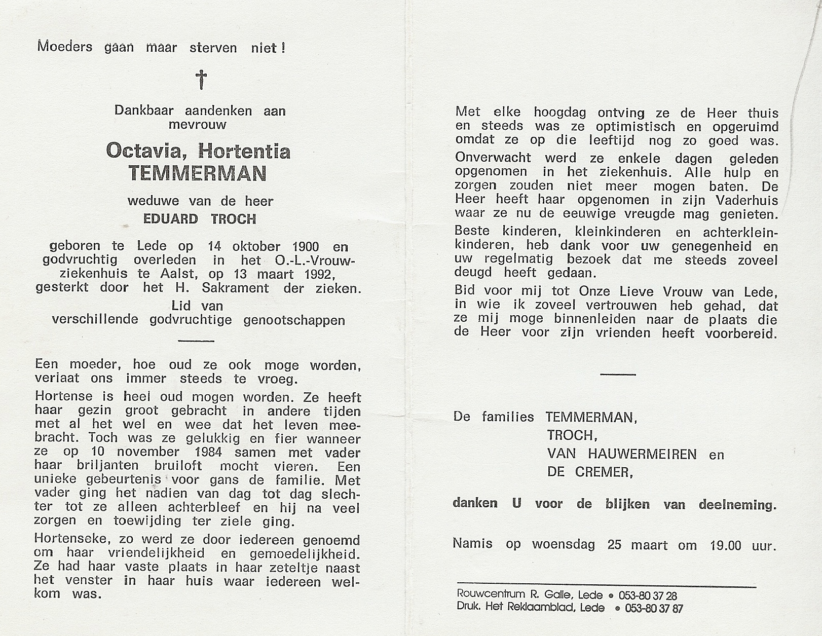 Octavia Hortensia Temerman Geboren: 14 oktober 1900 34 27 — Lede Overleden: 13 maart 1992 — Aalst |