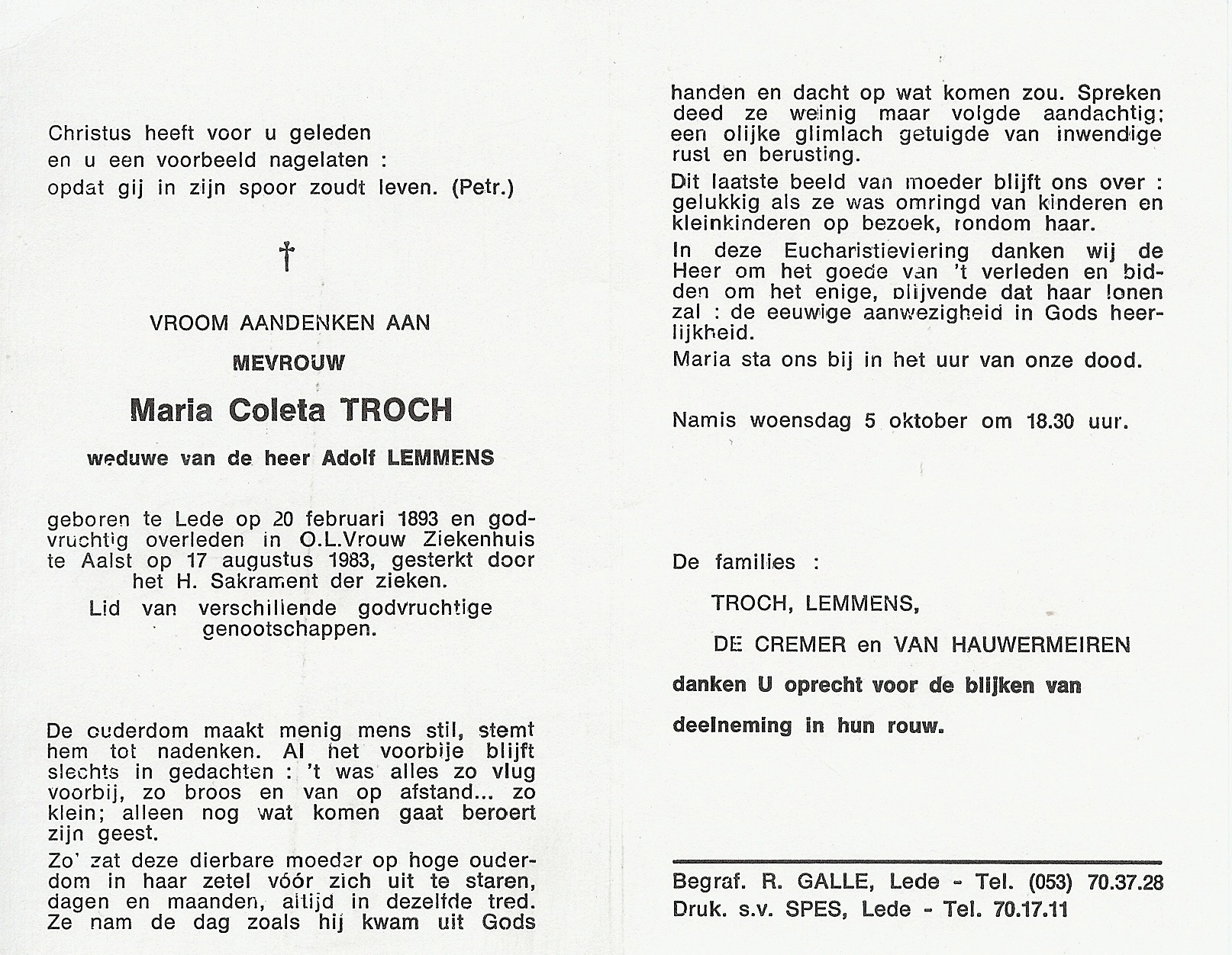 Maria Coleta Troch Geboren: 20 februari 1893 — Lede Overleden: 17 augustus 1983 — Aalst |