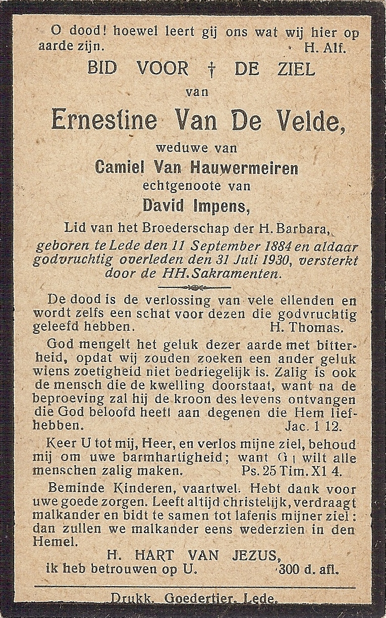Ernestine Van de Velde Geboren: 11 september 1884 — Lede Overleden: 31 juli 1930 — Lede |