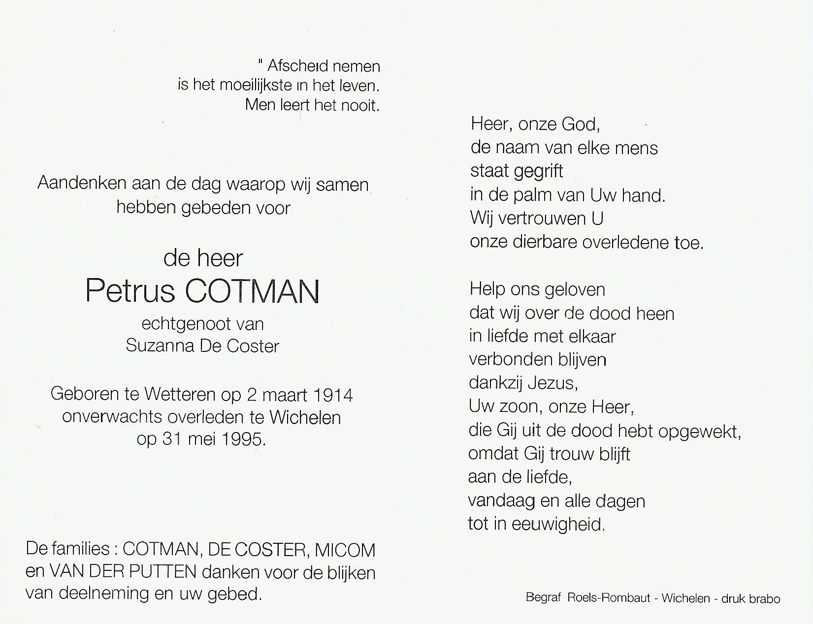Petrus Cotman Geboren: 2 maart 1914 — Wetteren Overleden: 31 mei 1995 — Wichelen |