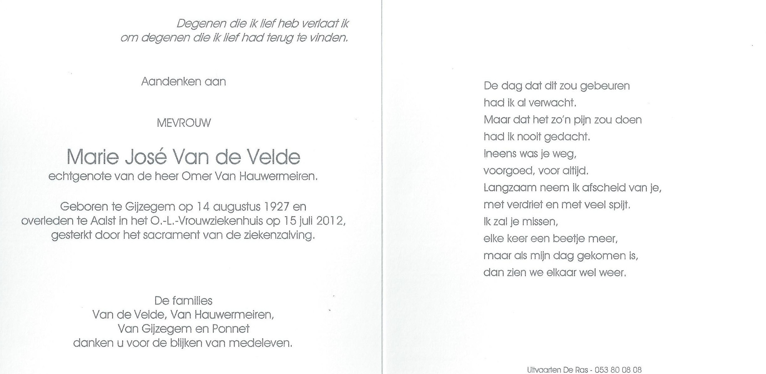 Marie José Agnes Van de Velde Geboren: 14 augustus 1927 — Gijzegem Overleden: 15 juli 2012 — Aalst |