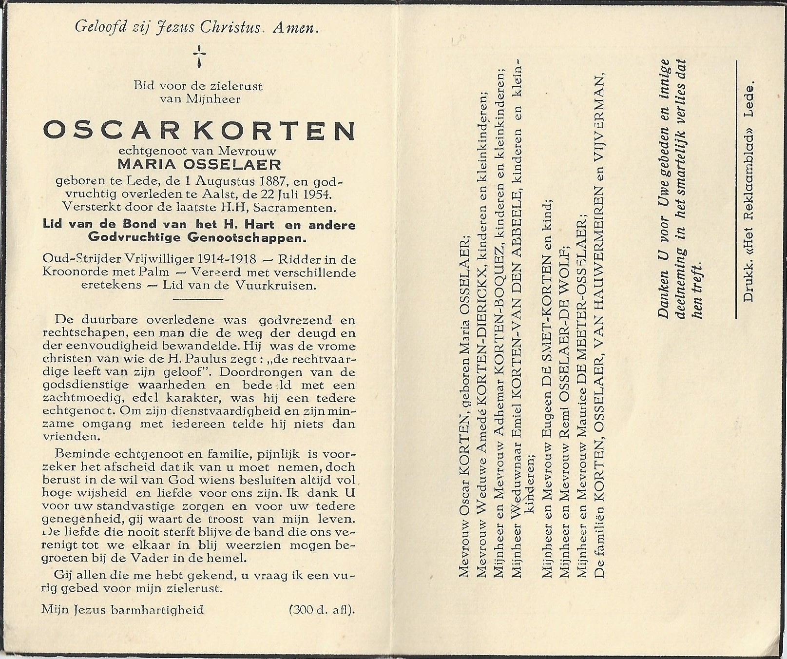 Oscar Korten Geboren: 1 augustus 1887 30 26 — Lede Overleden: 22 juli 1954 — Aalst |