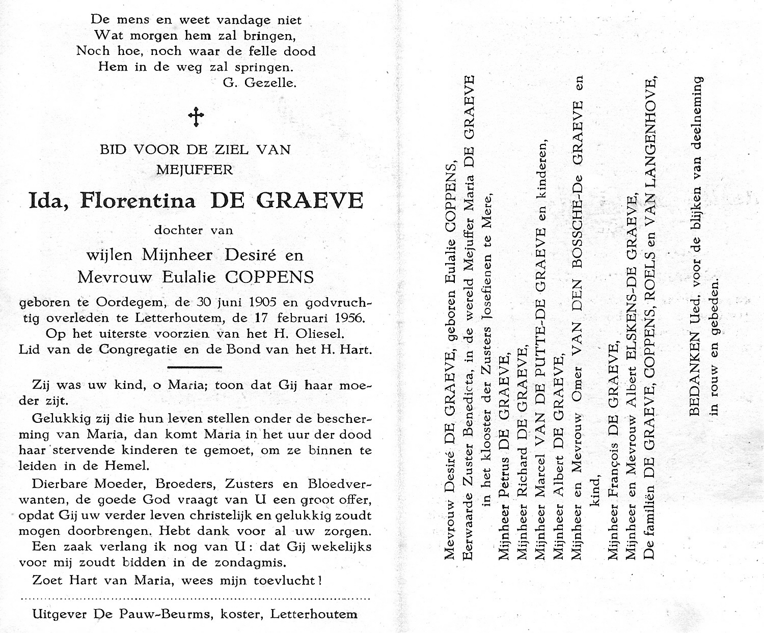 Ida Florentina De Graeve Geboren: 30 juni 1905 25 25 — Oordegem Overleden: 17 februari 1956 — Letterhoutem |